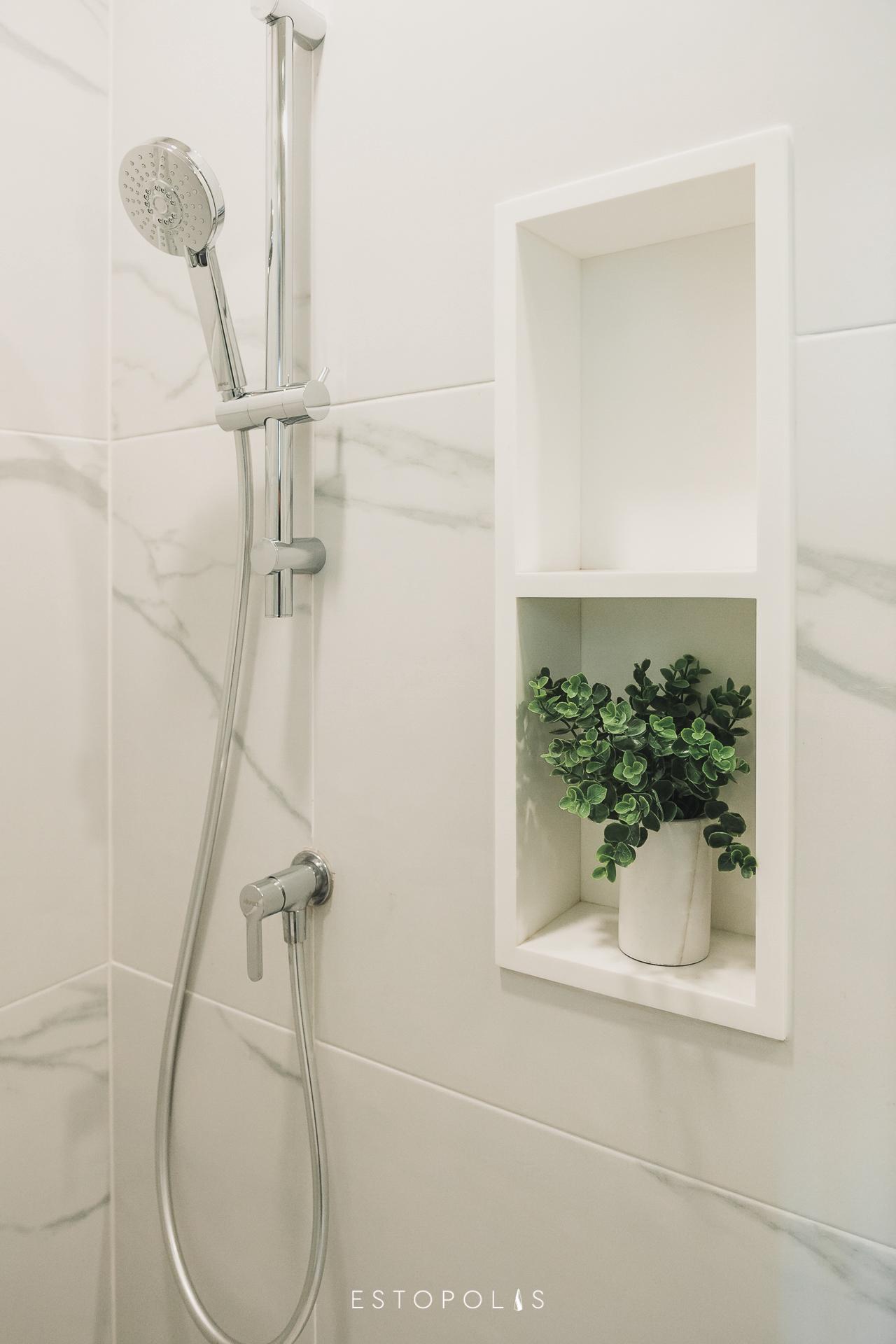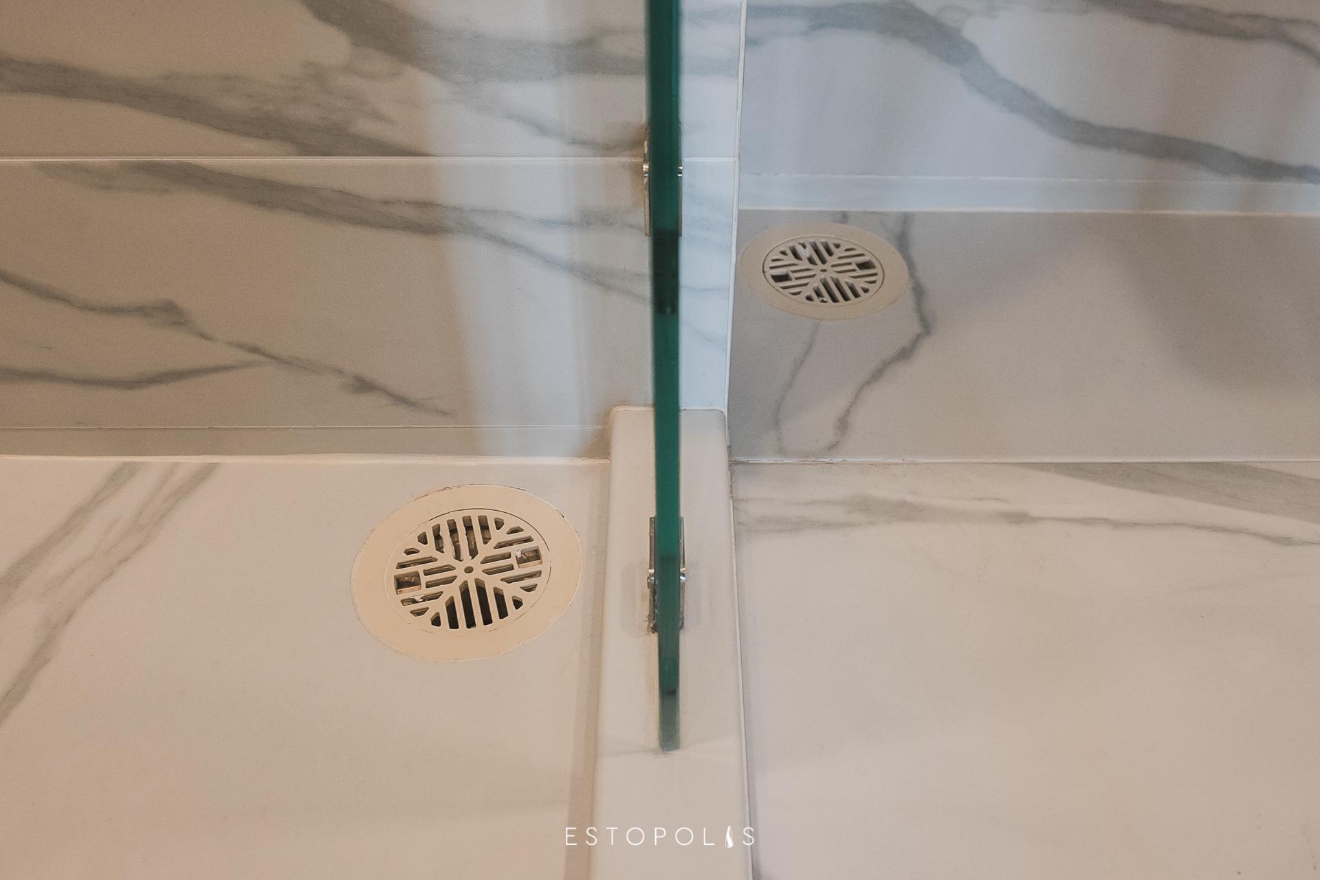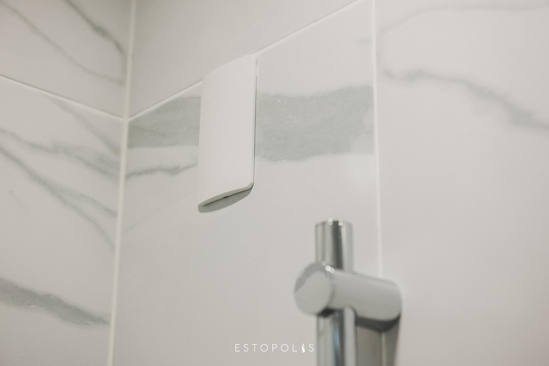 อีกฝั่งจะเป็นโซนเปียกที่กั้นด้วยพาร์ติชั่นกระจก Tempered glass สูงเกือบ 2 เมตร จึงช่วยกันน้ำกระเด็นออกมาข้างนอกได้เป็นอย่างดี