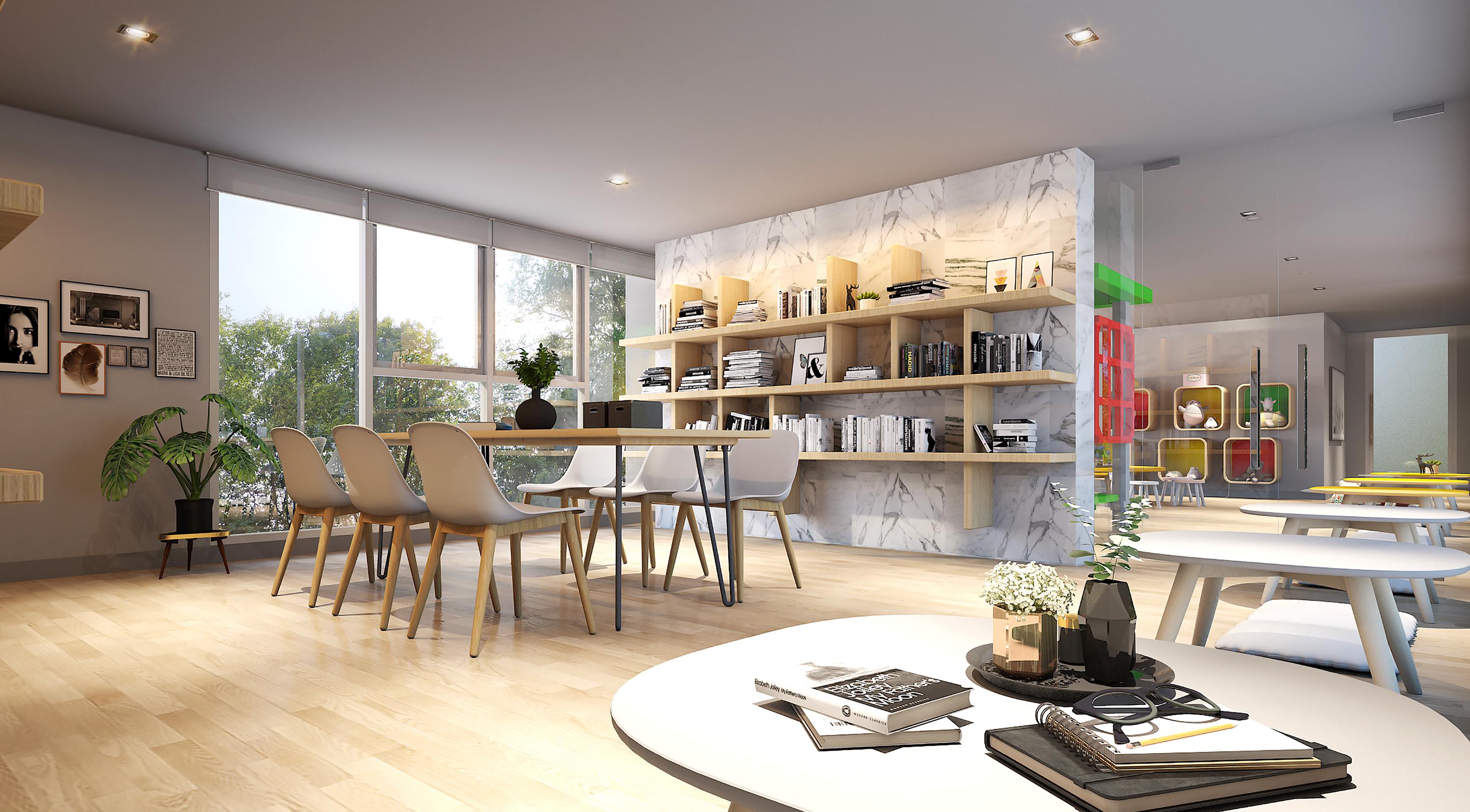 และหากใครต้องการความสงบและใช้สมาธิในการทำการบ้าน หรือนั่งทำงานก็สามารถแวะมา Library Room ห้องที่อยู่ข้างเคียงกันได้ ซึ่งทางโครงการจะจัดโต๊ะและเก้าอี้ให้ทุกคนในครอบครัวสามารถใช้พื้นที่ร่วมกันได้ เหมาะสำหรับใช้นั่งหารือ, ทำงานเป็นกลุ่ม หรือถ้าใครอยากได้ความเป็นส่วนตัว ที่นี่ก็มีโต๊ะแบบเดี่ยวจัดเตรียมไว้ให้พร้อมเช่นกัน รับรองว่า...ลงตัวทุกไลฟ์สไตล์ชีวิตแน่นอน