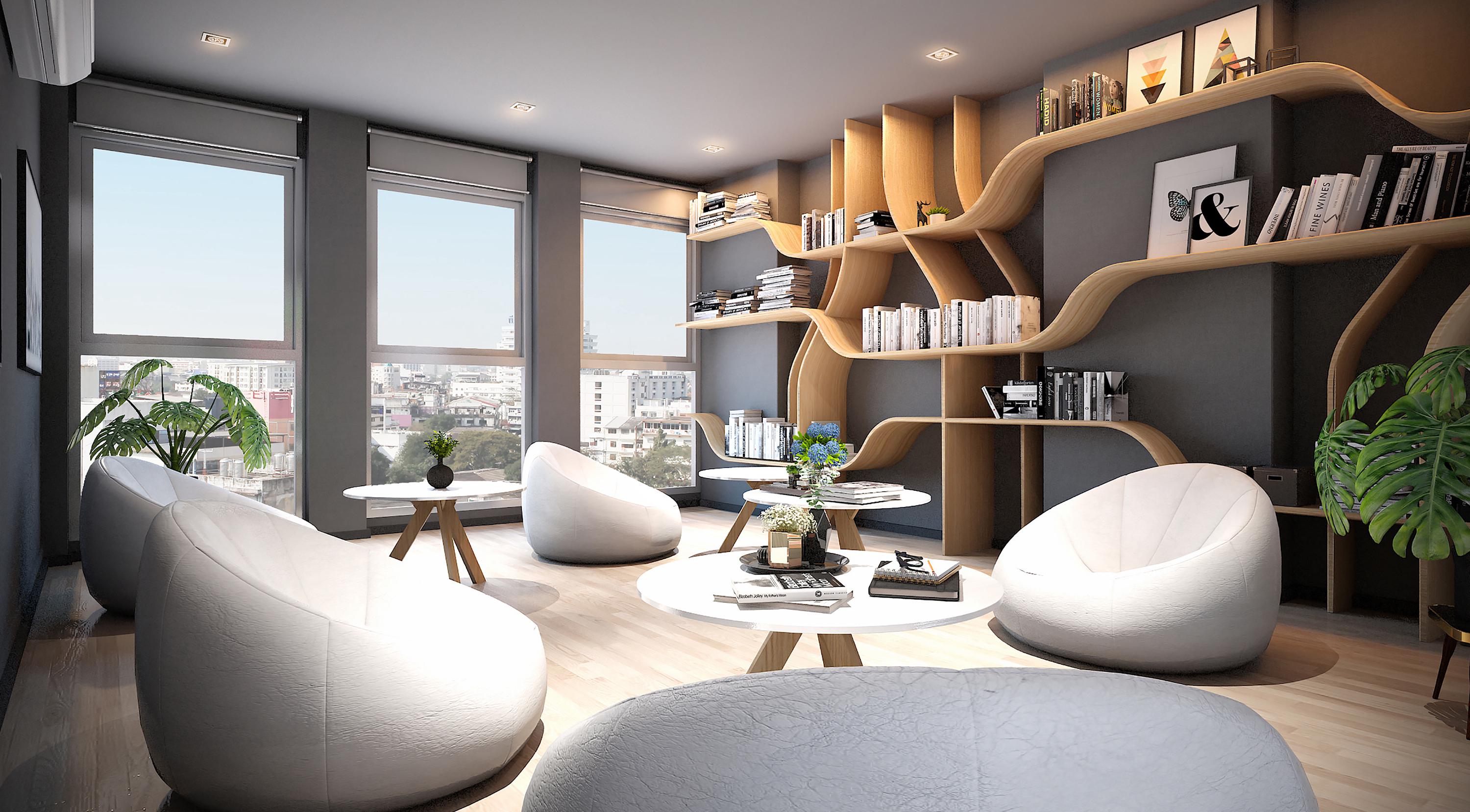ให้ทุกที่เหมาะกับไลฟ์สไตล์สงบ เพราะบนชั้น 8 ก็มี Library Room ให้ด้วยเช่นกัน ตั้งอยู่ข้างห้องฟิตเนสให้เรานั่งทำงาน อ่านหนังสือพร้อมชมวิวเมืองสวยๆ ในบรรยากาศสงบเงียบ