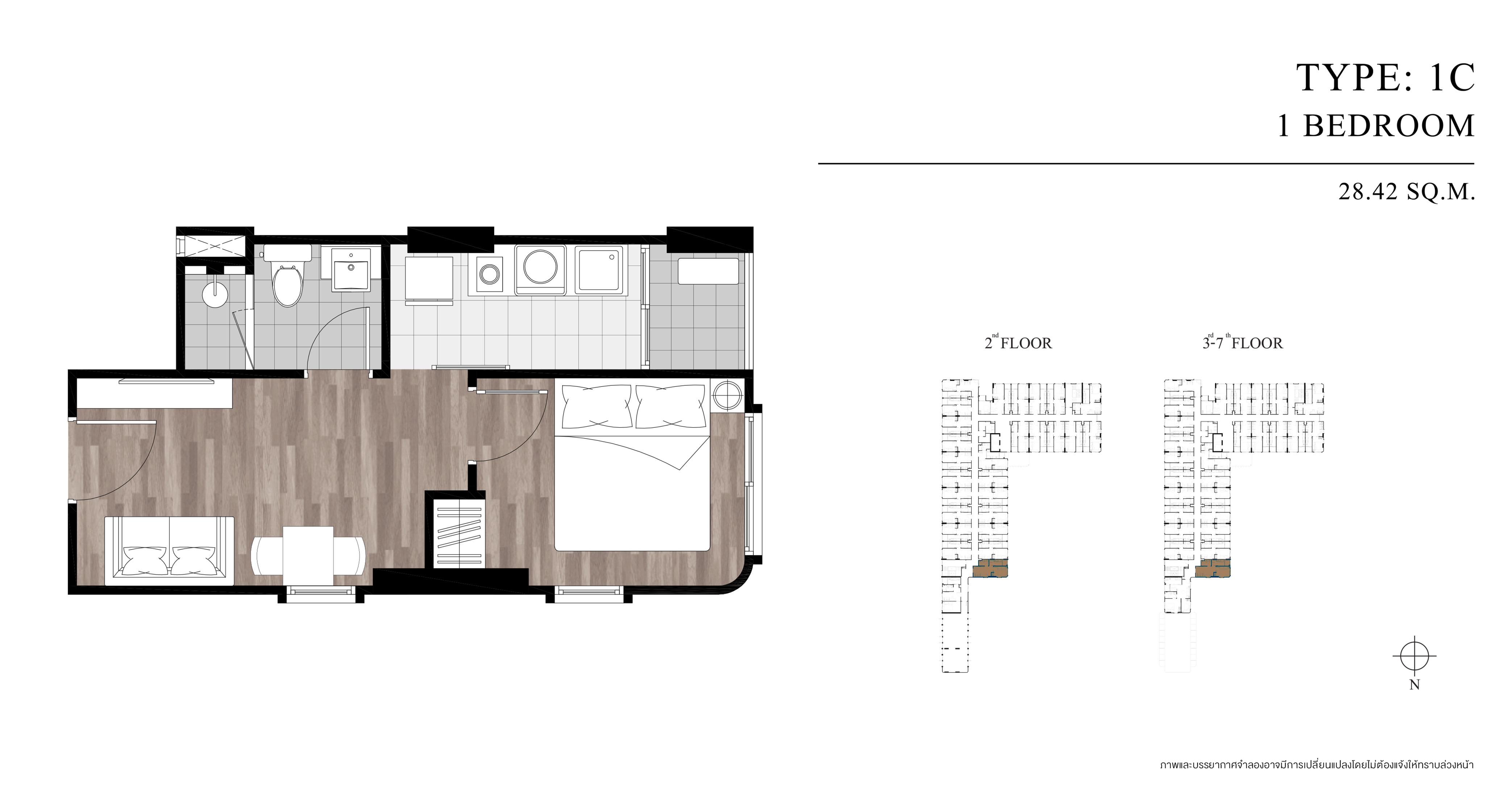 ถัดมาเป็นห้องขนาด 28.42 ตารางเมตร ซึ่งทางโครงการจะจัดวางไว้ให้ชั้นละ 1 ห้องเท่านั้น โดยตำแหน่งห้องจะอยู่ทางด้านหลังโครงการและหันระเบียงไปทางทิศตะวันตก เหมาะสำหรับคนที่ชอบห้องสว่างๆ ในตอนกลางวัน