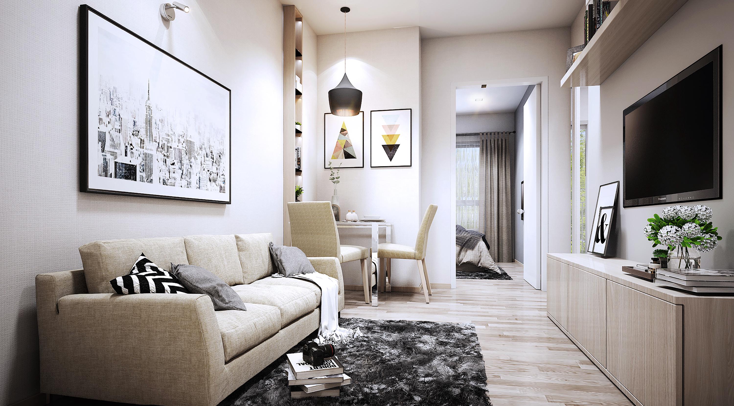 สำหรับใครที่อยากได้ห้องพักอาศัยกว้างๆ ในขนาดที่ไม่เล็กหรือใหญ่จนเกินไป ก็แนะนำให้ดูเป็นห้องมุมขนาดพื้นที่ใช้สอย 32.07 ตารางเมตร ที่ออกแบบให้ห้องนั่งเล่นมีพื้นที่กว้างขึ้นเป็นพิเศษ สามารถพักผ่อนได้สบายๆ