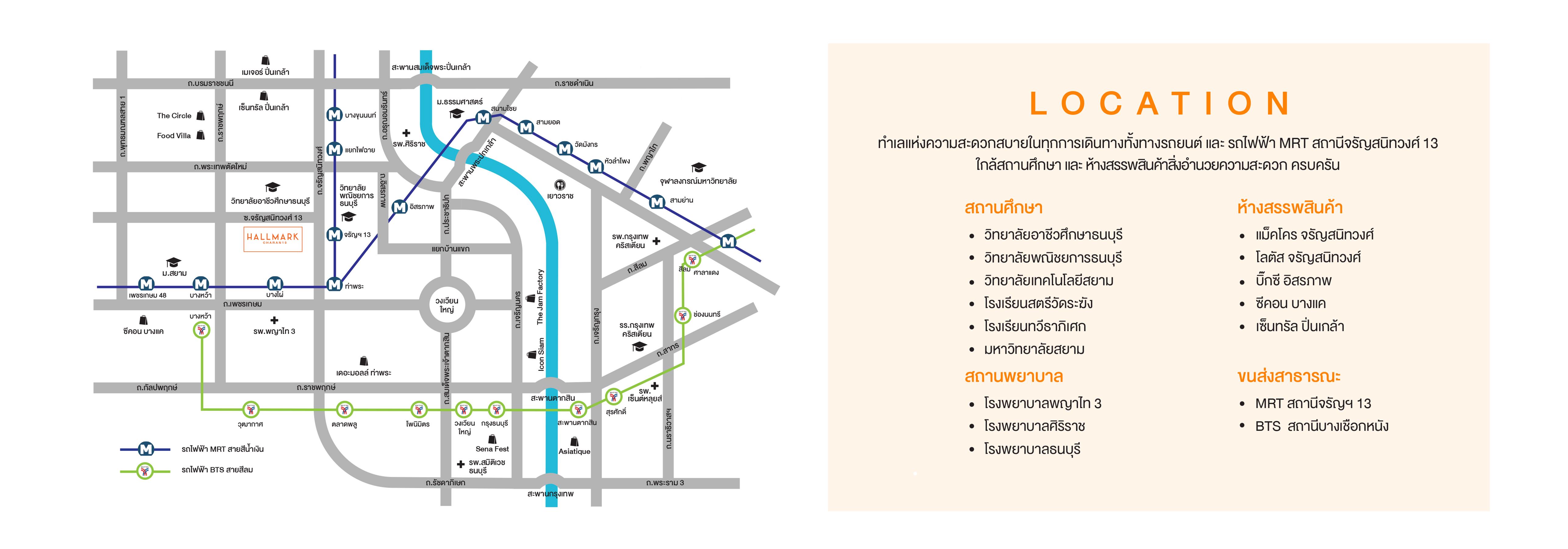 โครงการ Hallmark Charan 13 ( ฮอลล์มาร์ค จรัญฯ 13) ตั้งอยู่ซอยจรัญสนิทวงศ์ 13 ใกล้กับสถานศึกษาและสิ่งอำนวยความสะดวกย่านฝั่งธนฯ