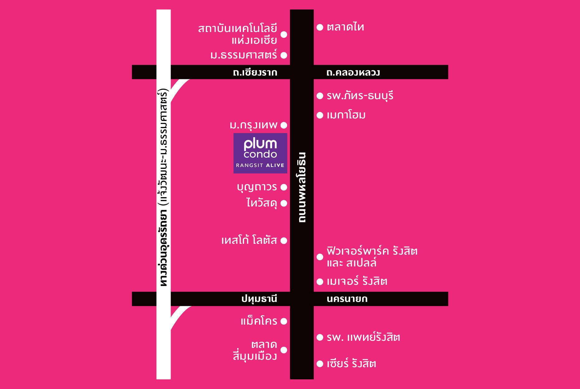 โครงการ Plum Condo Rangsit Alive (พลัมคอนโด รังสิต อไลฟ์) ตั้งอยู่ในย่าน 'รังสิต' ติดกับ 'ถนนพหลโยธินฝั่งขาออกเมือง' ซึ่งเป็นถนนเส้นหลักที่ใช้ในการเชื่อมต่อออกไปยังพื้นที่ต่างๆ ทั้งยังรายล้อมไปด้วยสิ่งอำนวยความสะดวกมากมาย