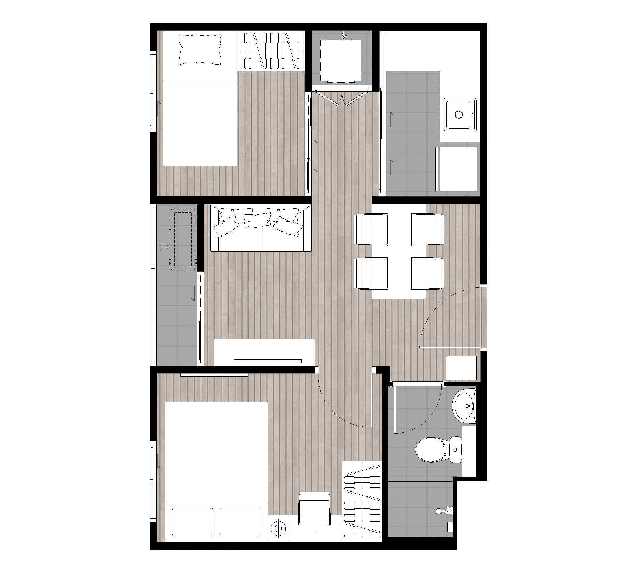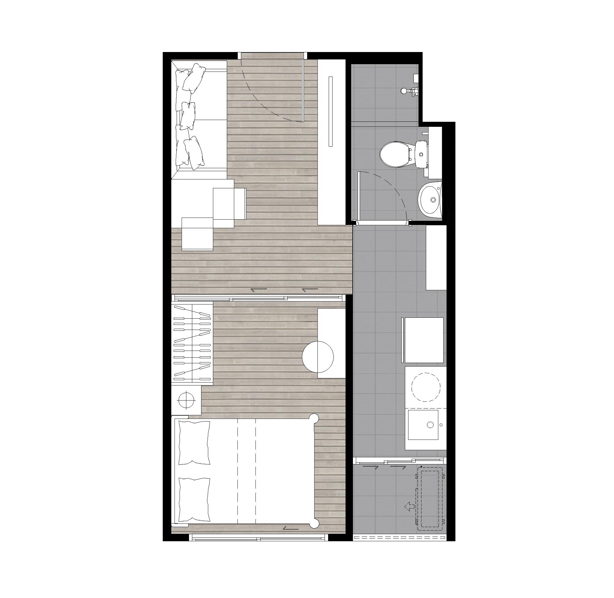 ขยับมาที่ส่วนของห้องพักอาศัยกันบ้าง โดยห้องแรกที่จะพาไปสำรวจเป็นห้อง Type 1 Bedroom ที่มีจำนวนยูนิตเยอะที่สุดในโครงการ ทุกสัดส่วนพื้นที่กว่า 26.25 ตารางเมตรถูกจัดวางไว้อย่างลงตัว เพื่อรองรับทุกจังหวะของการใช้ชีวิต