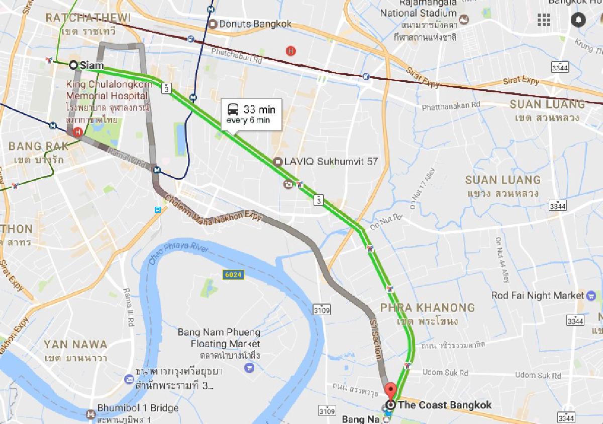 รีวิวนี้เลือกใช้การเดินทางด้วยรถไฟฟ้า เนื่องจากคอนโด The Coast อยู่ใกล้กับรถไฟฟ้าสถานีบางนา โดยจากสถานีสยาม ใช้เวลาเดินทางเพียง 30 นาที