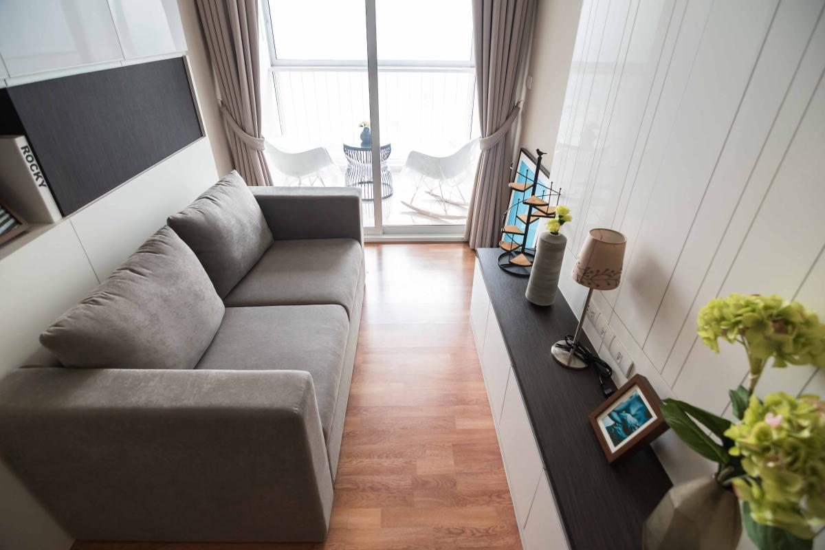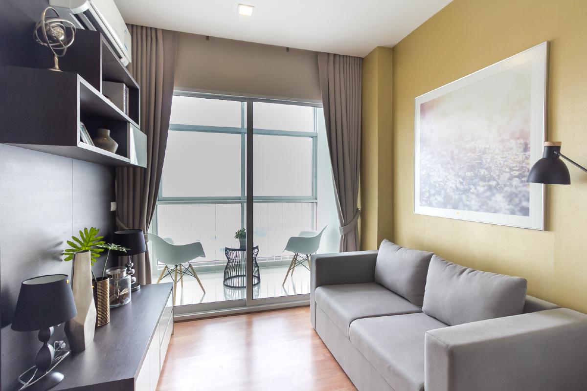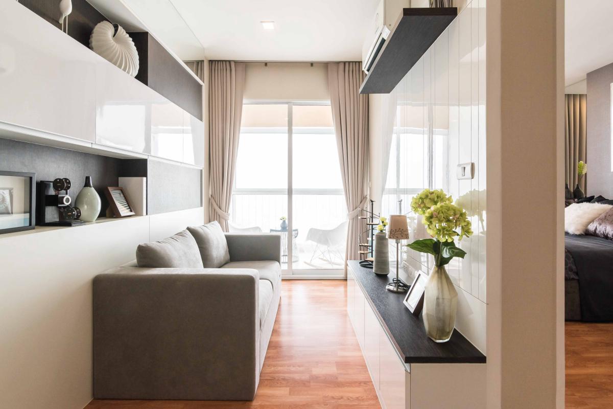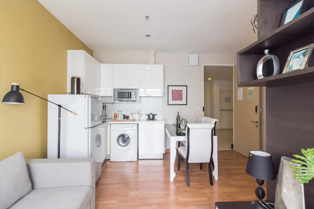 ห้องขนาด 34.58 ตรม. มาพร้อมกับเฟอร์นิเจอร์ที่ครบครัน พร้อมอยู่ ทั้งที่นอน โซฟา ตู้เสื้อผ้า ชุดครัวแบบ Built in