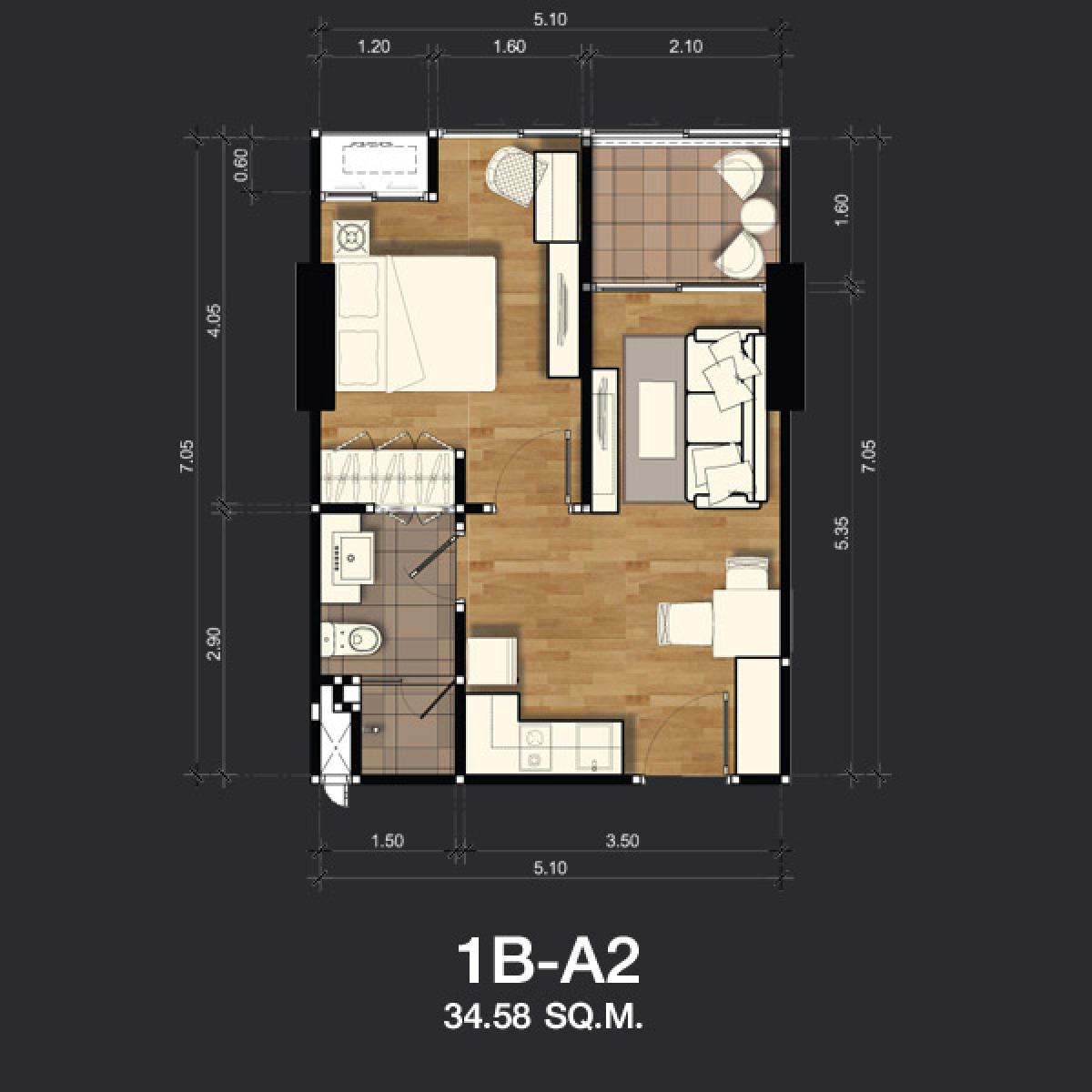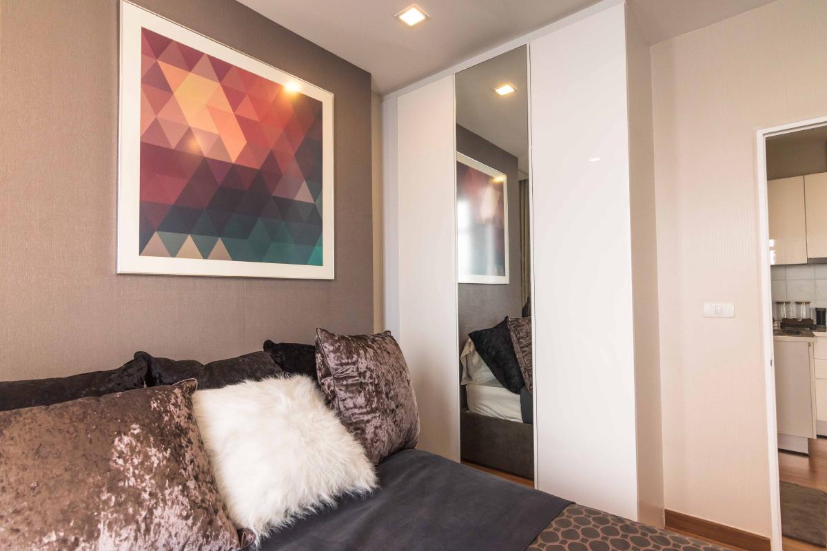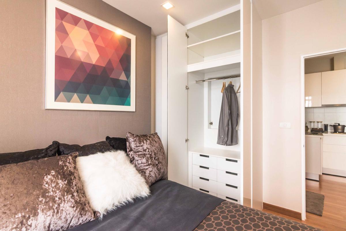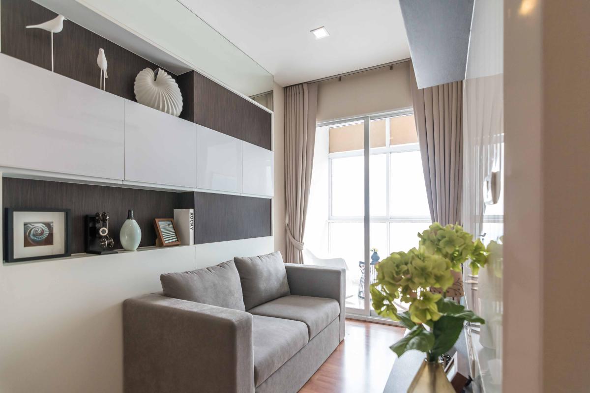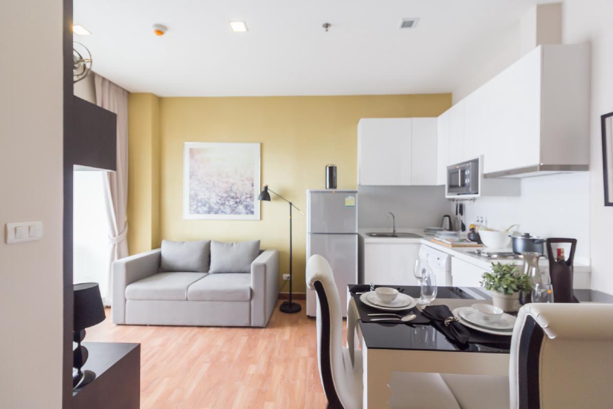 ห้องขนาด 34.58 ตรม. มาพร้อมกับเฟอร์นิเจอร์ที่ครบครัน พร้อมอยู่ ทั้งที่นอน โซฟา ตู้เสื้อผ้า ชุดครัวแบบ Built in