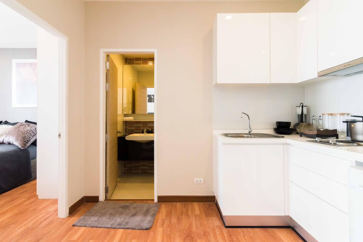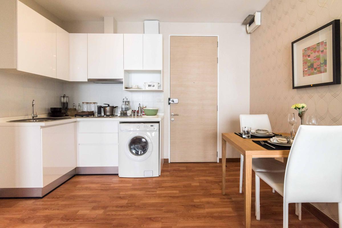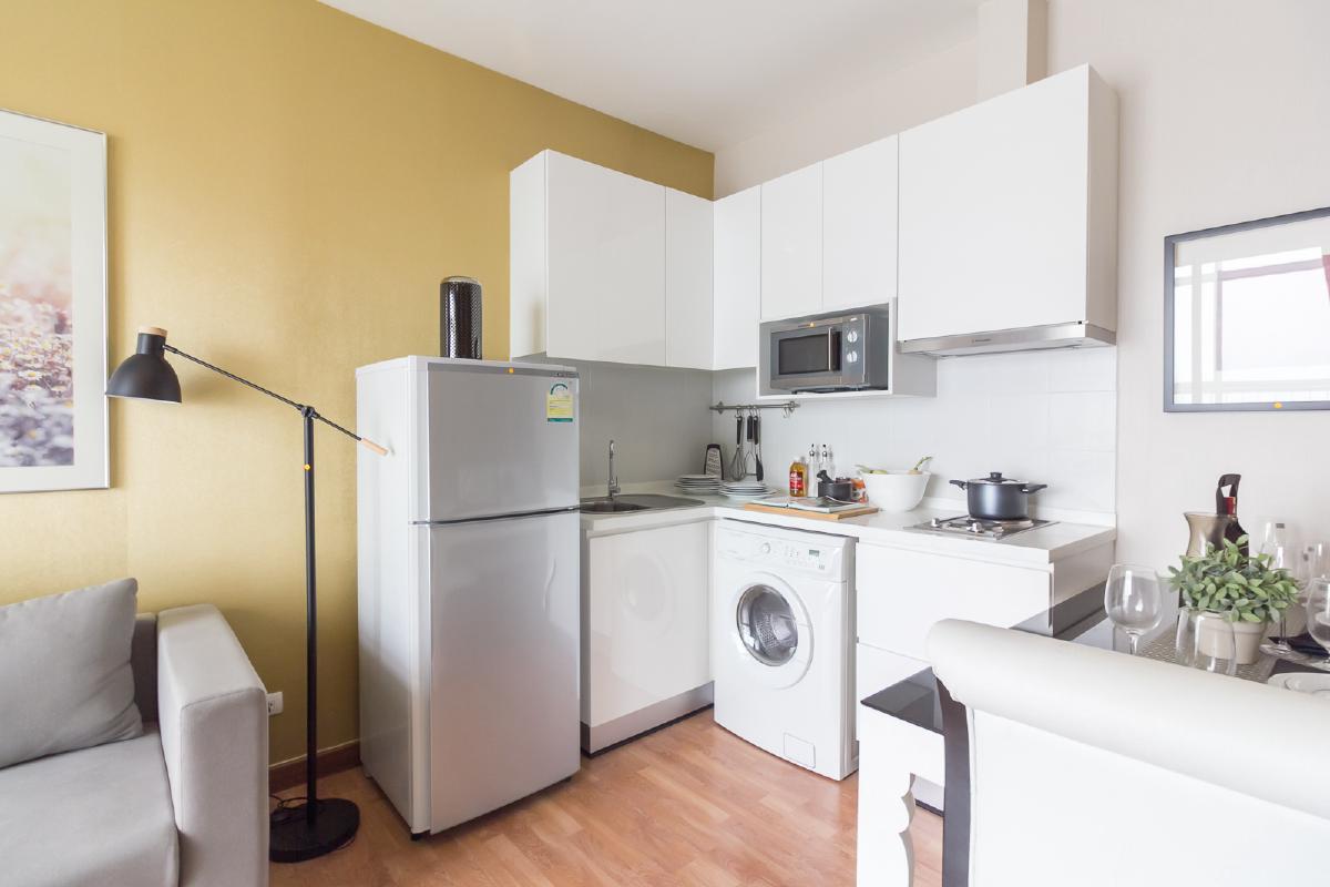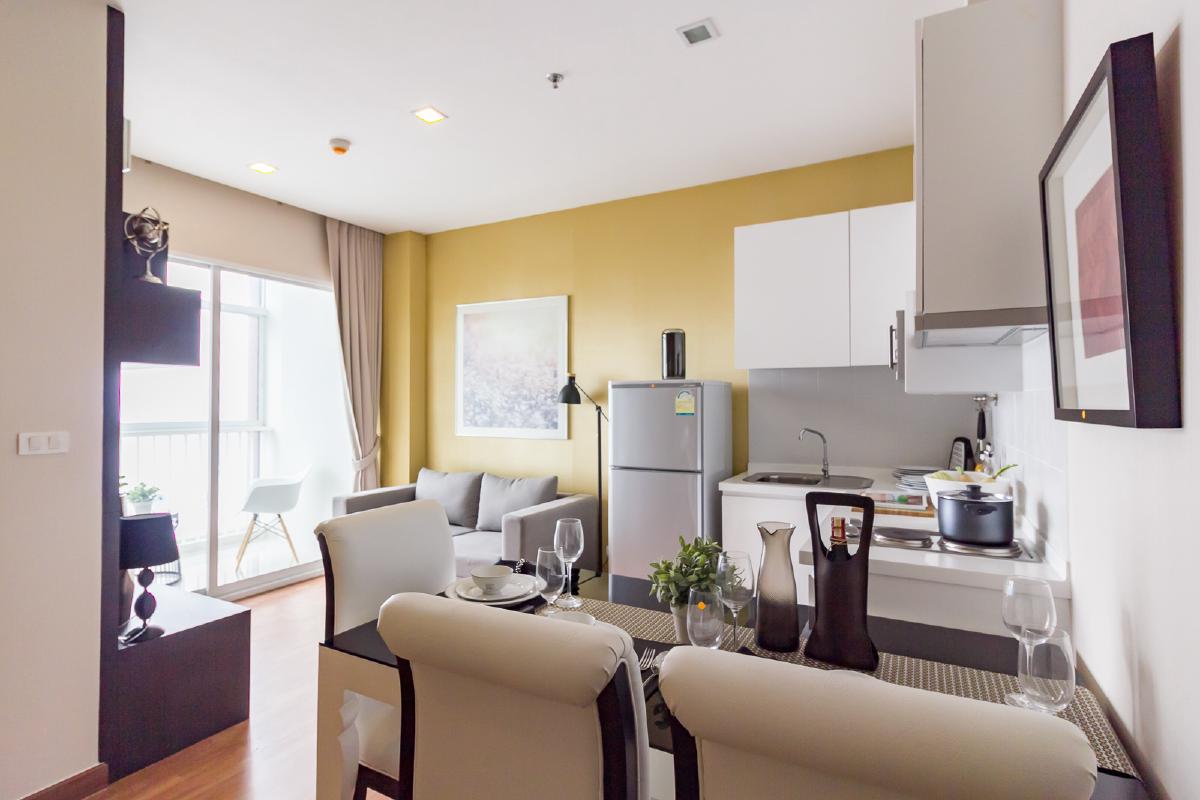 ห้องขนาด 34.58 ตรม. มาพร้อมกับเฟอร์นิเจอร์ที่ครบครัน พร้อมอยู่ ทั้งที่นอน โซฟา ตู้เสื้อผ้า ชุดครัวแบบ Built in