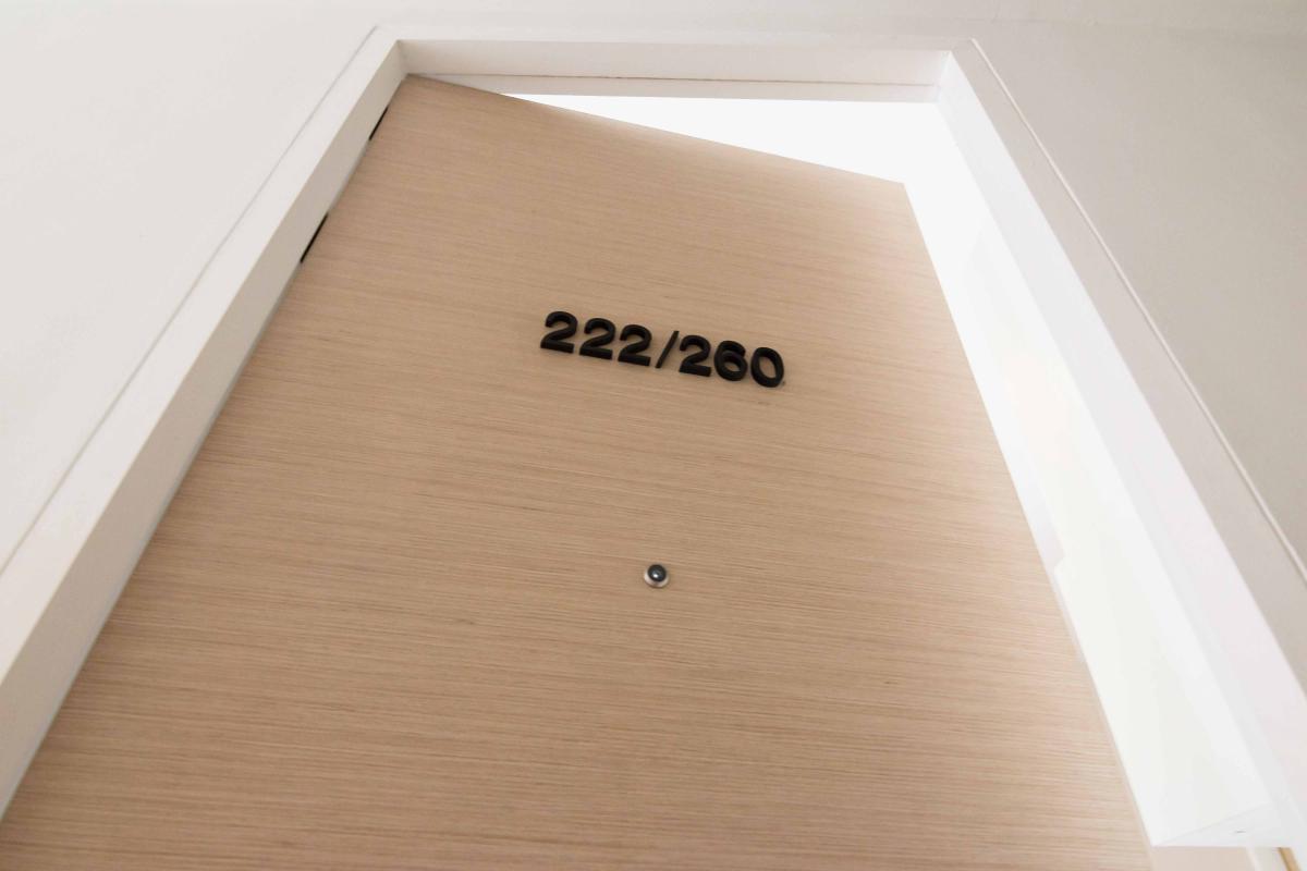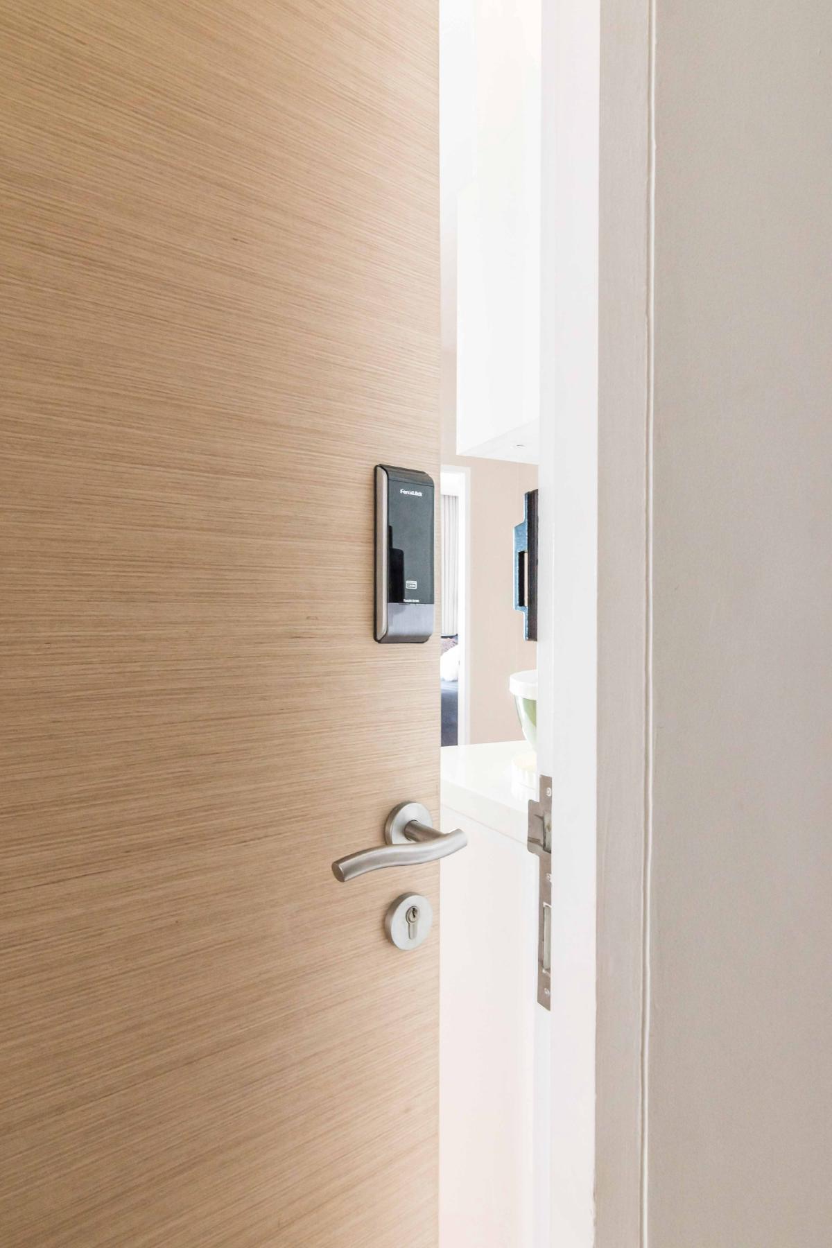 เริ่มจากที่ประตูเข้าห้องจะเป็นไม้ย้อมด้วยสีธรรมชาติ พร้อม Digital door lock เหมือนกับห้อง 1 ห้องนอน