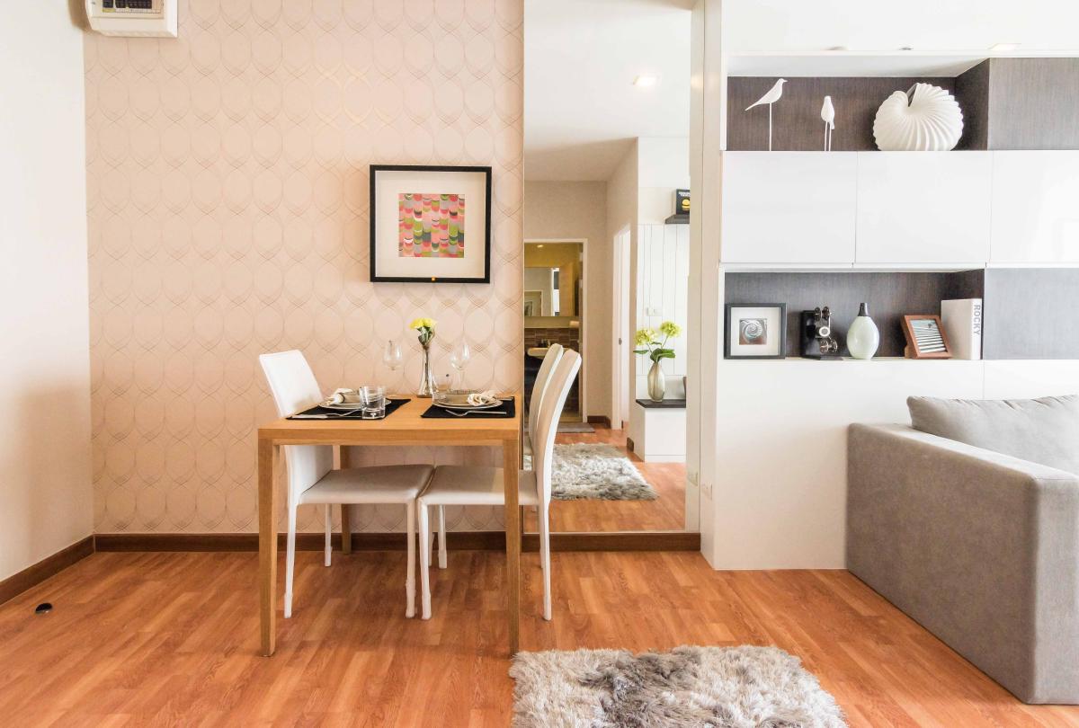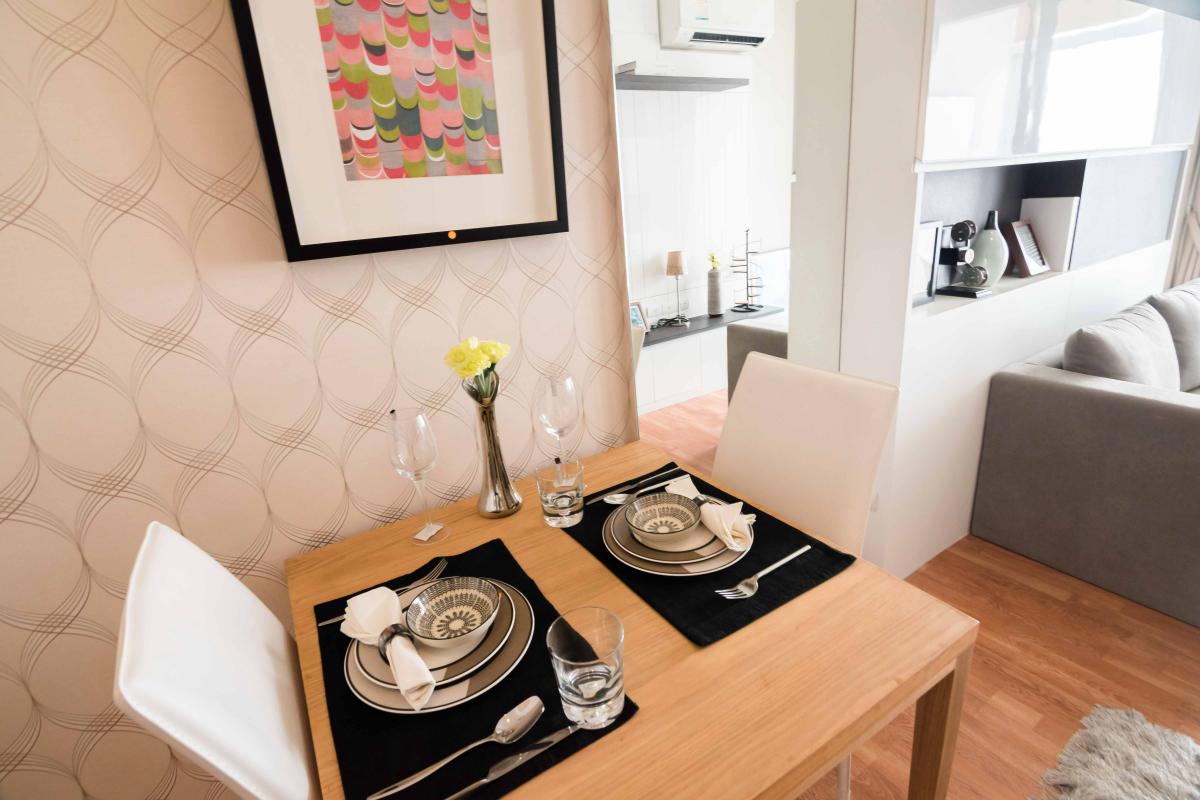 โต๊ะทานข้าวจะเป็นสำหรับ 2 ท่านวางชิดผนังห้อง จากรูปจะเห็นว่ามีพื้นที่ใช้สอยเหลือเฟือ ส่วนผนังบริเวณโต๊ะทานข้าวจะเป็นแบบฉาบเรียบและติดวอลเปเปอร์