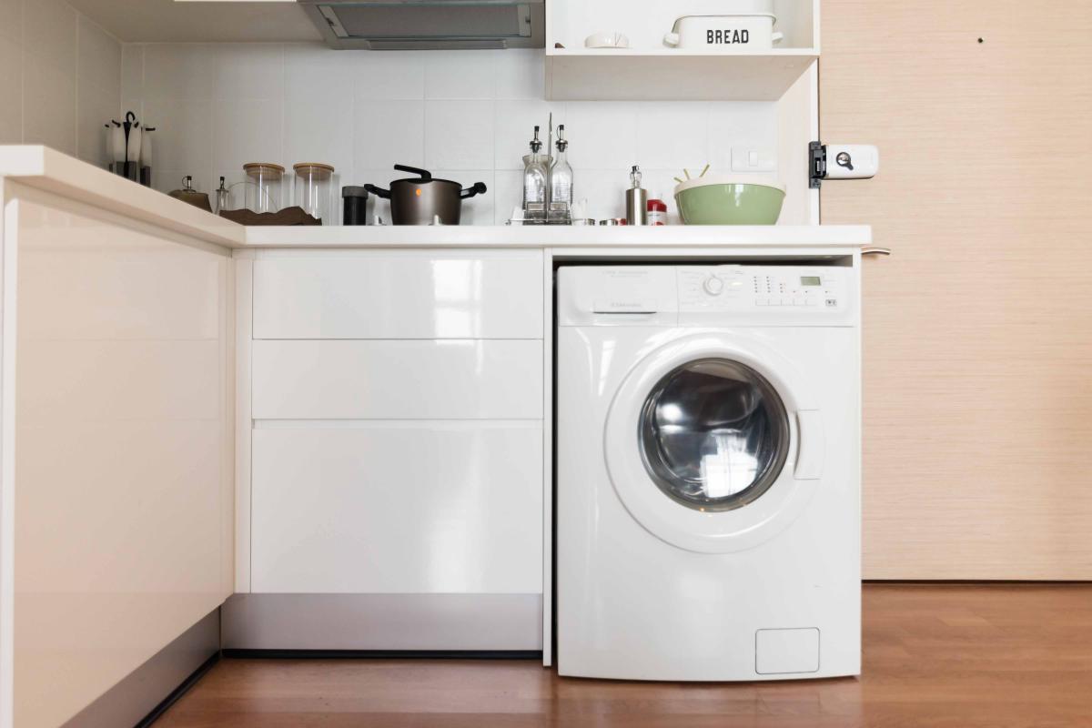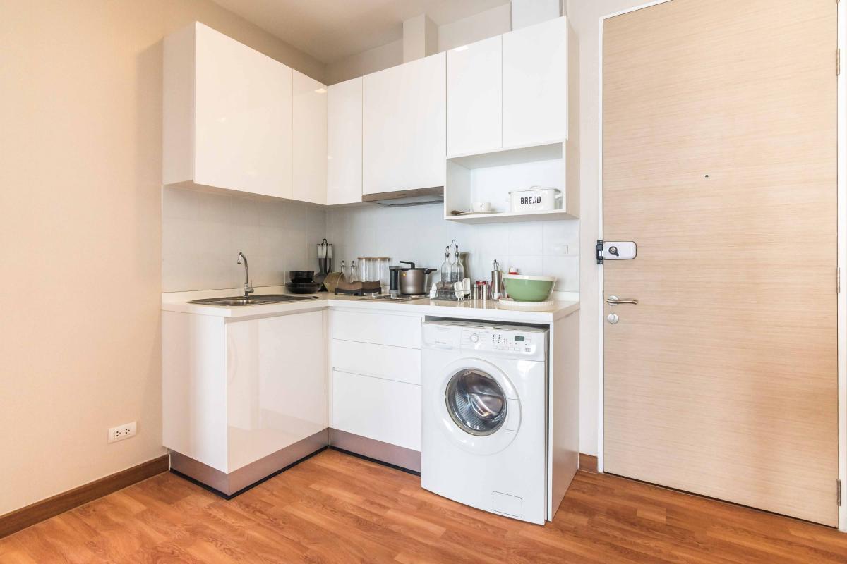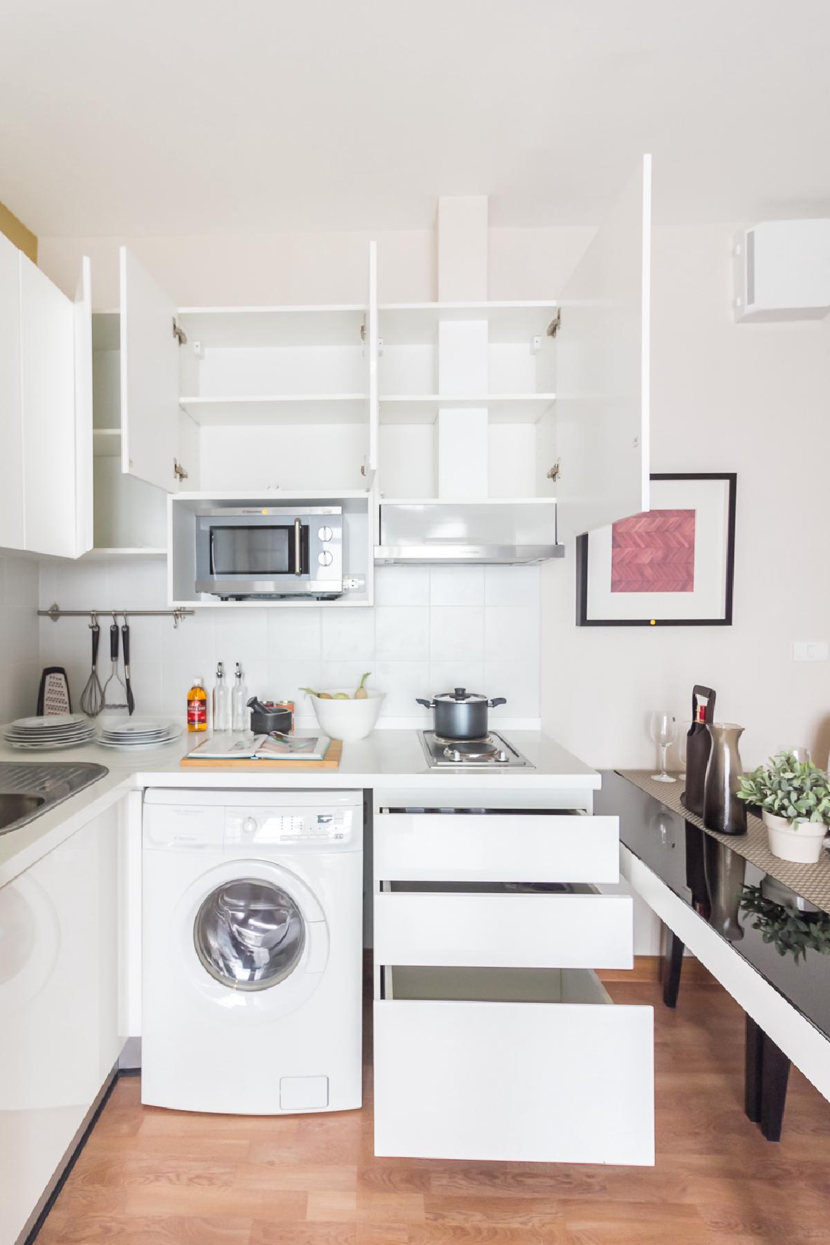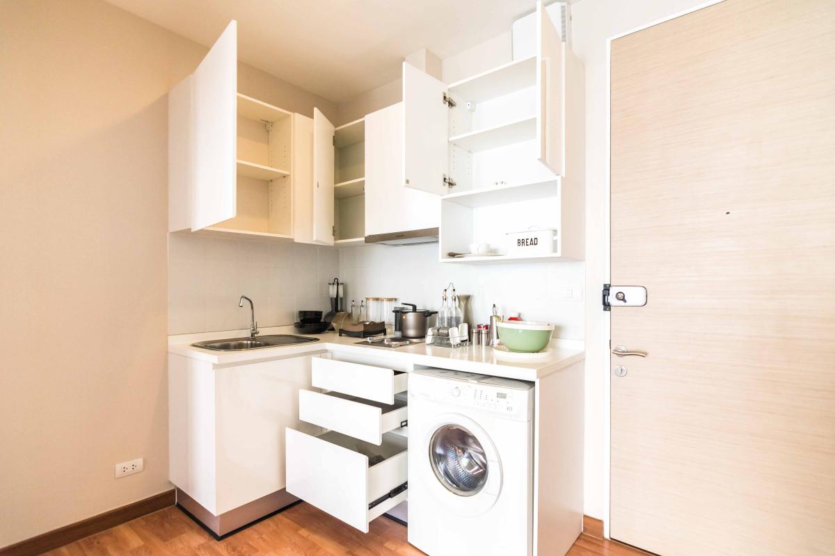 บานด้านหน้าของครัวก็จะเป็นลิ้นชักเก็บของอย่าง จาน ชาม ช้อน ส้อม ส่วนด้านขวาก็สามารถวางเครื่องซักผ้าได้อีก 1 เครื่อง