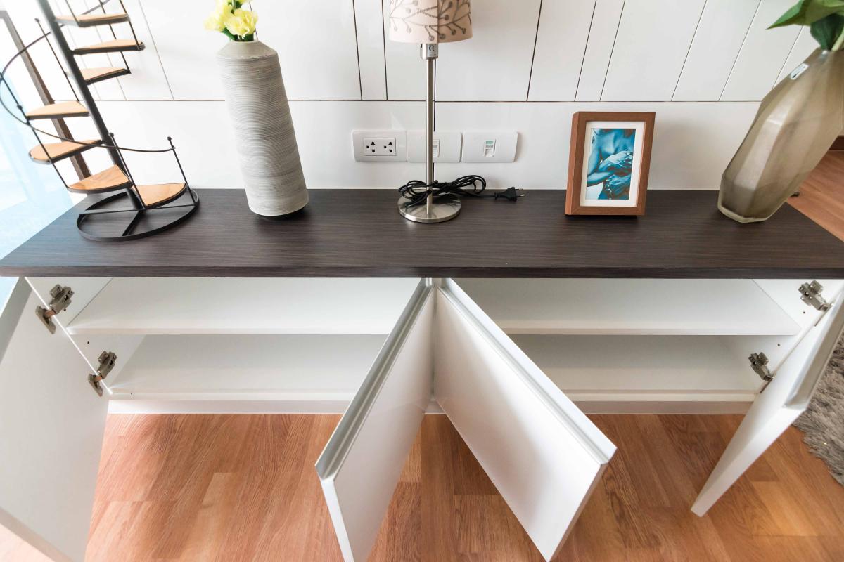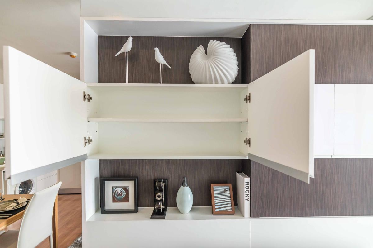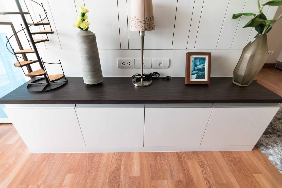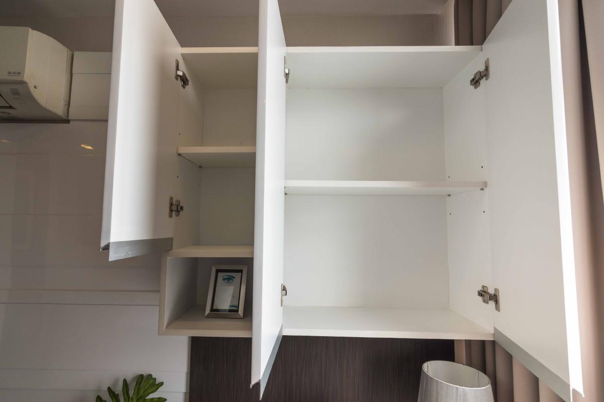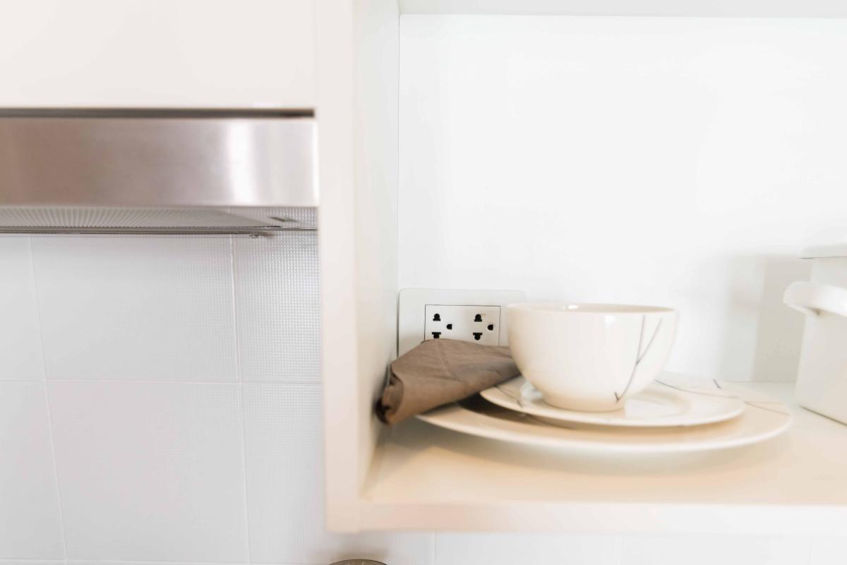 ชั้นวางของด้านบนสามารถวางไมโครเวฟขนาดมาตรฐานได้ โดยโครงการได้ทำเต้าเสียบเตรียมไว้ให้ 1 จุด