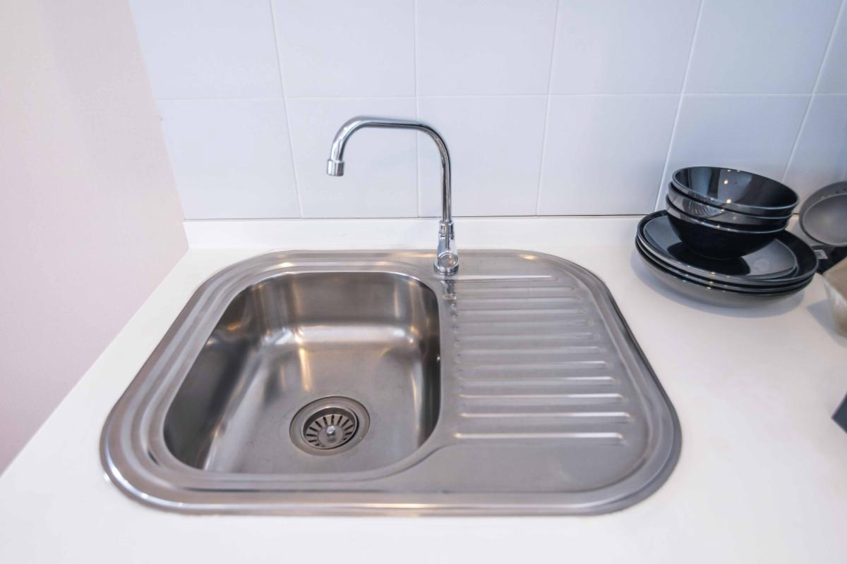 อ่างล้างจาน ทำจากสแตนเลสแบบหลุมเดียวพร้อมก๊อกน้ำยี่ห้อ Mex ด้านบนมีชั้นเก็บของแบบ Built in