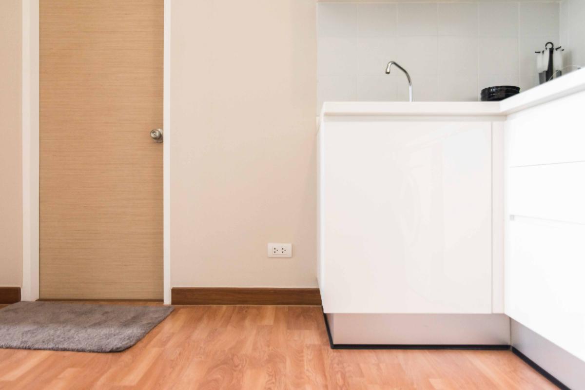 ด้านข้างเคาน์เตอร์ก่อนถึงประตูห้องน้ำยังมีพื้นที่เหลือ พอที่จะวางตู้เย็นสักเครื่อง