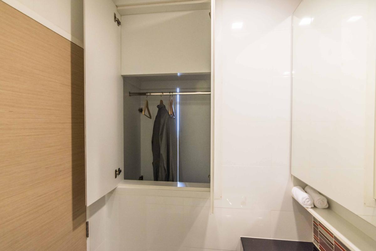 ด้านหลังประตู มีช่องลับที่สามารถเปิด แล้วหยิบเสื้อผ้าจากตู้เสื้อผ้าในห้องนอนได้เลย