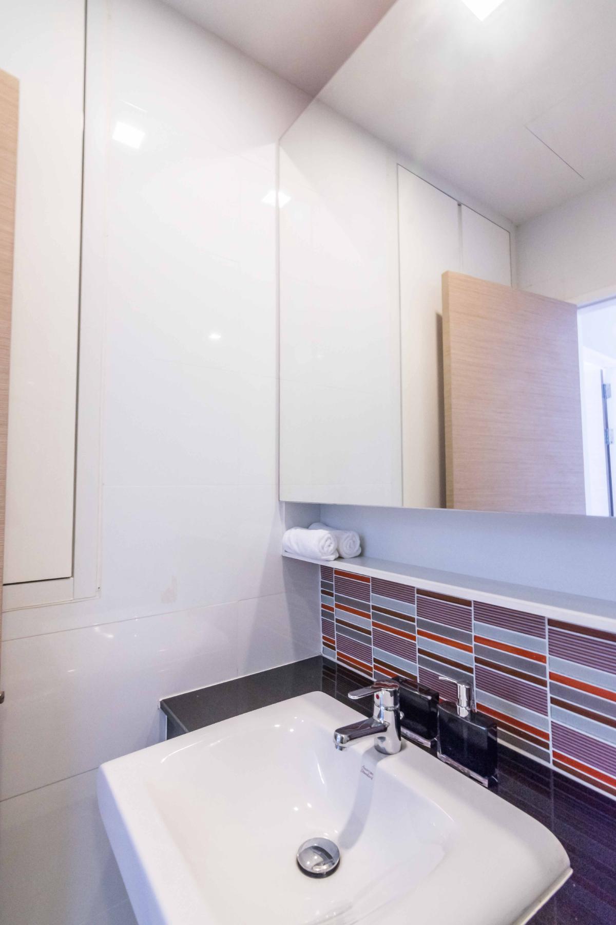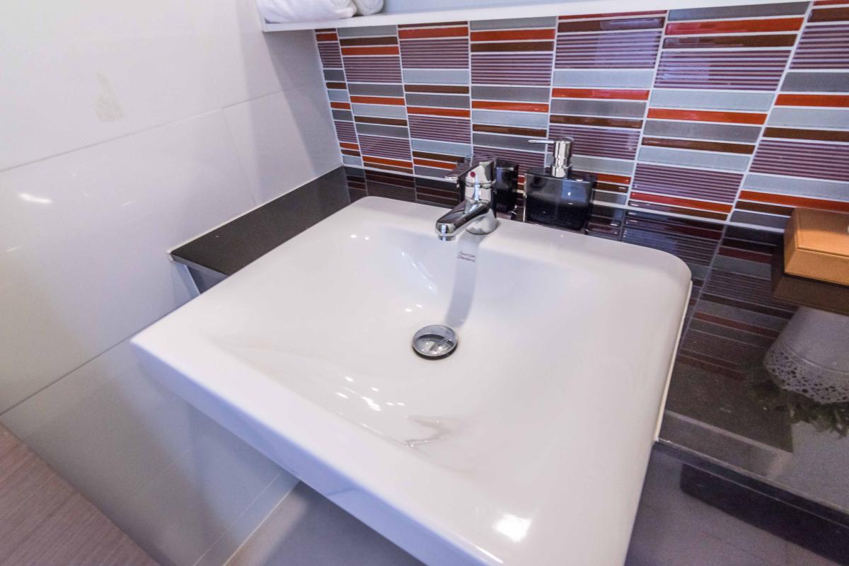 เคาน์เตอร์จะเป็นหินอ่อนอัด ที่ทำความสะอาดง่าย เพียงแค่ใช้น้ำเปล่า ไม่ควรใช้น้ำยาที่มีความเป็นกรด เพราะจะทำให้คราบติดแน่น