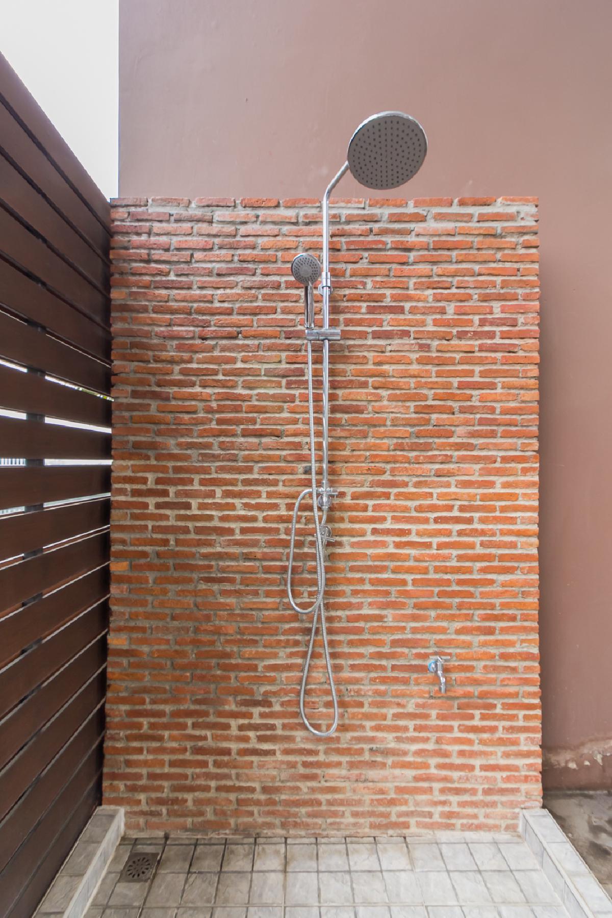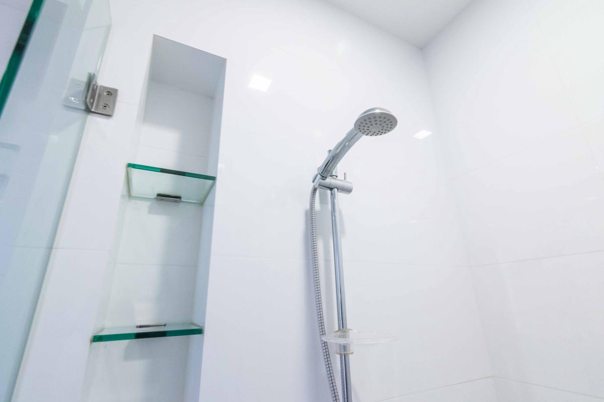 ฝักบัวแบบ Hand Shower และก๊อกน้ำเป็นของอเมริกัน แสตนดาร์ท ตรงผนังเว้นช่องไว้ให้ว่างอุปกรณ์อาบน้ำต่างๆ