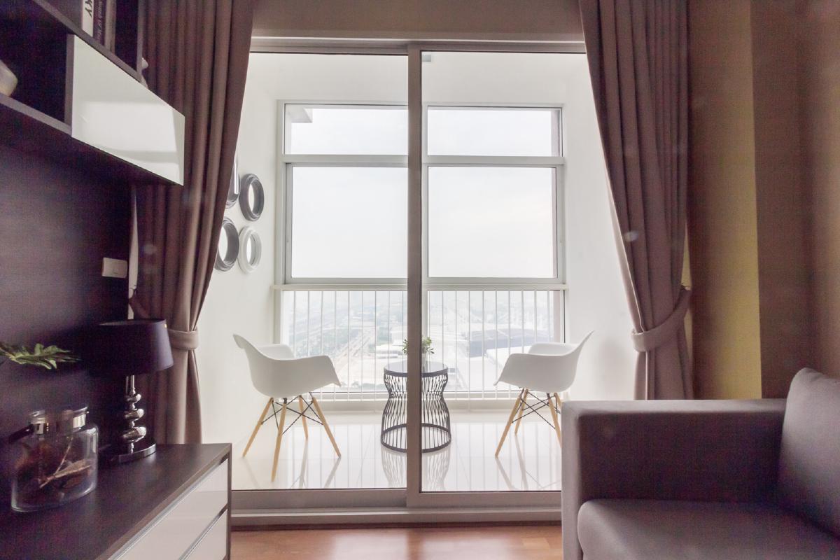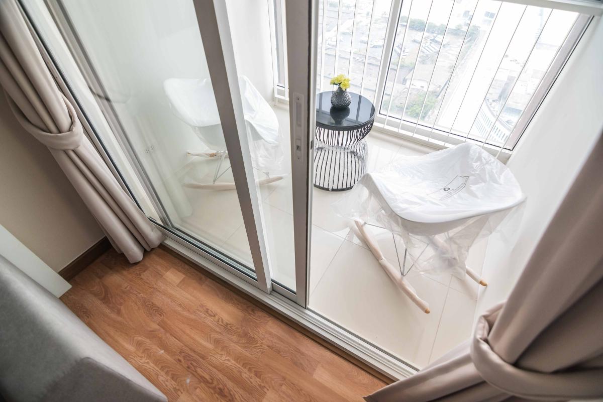 ประตูทางออกไประเบียงจะเป็นกระจกใส รกอบอลูมิเนียมแบบบานเลื่อน และมีผ้าม่านปิดปกกันแสงสว่างรบกวนการพักผ่อน