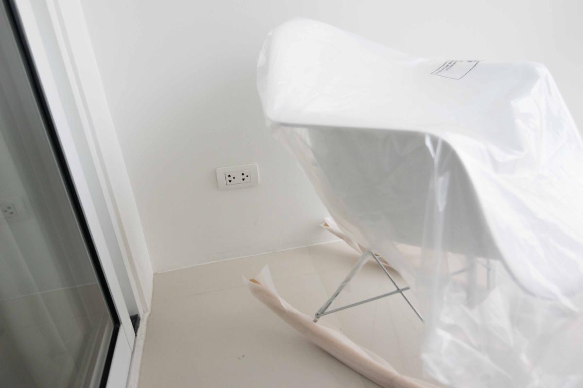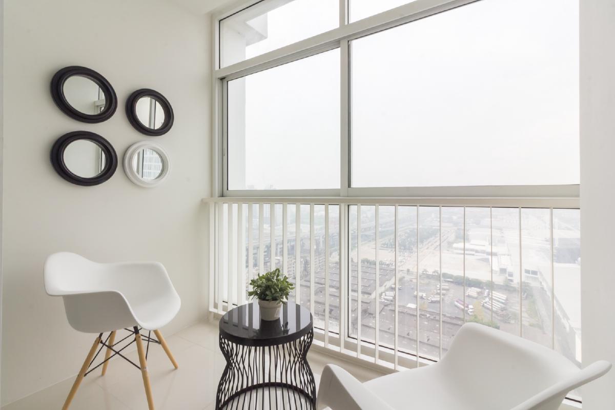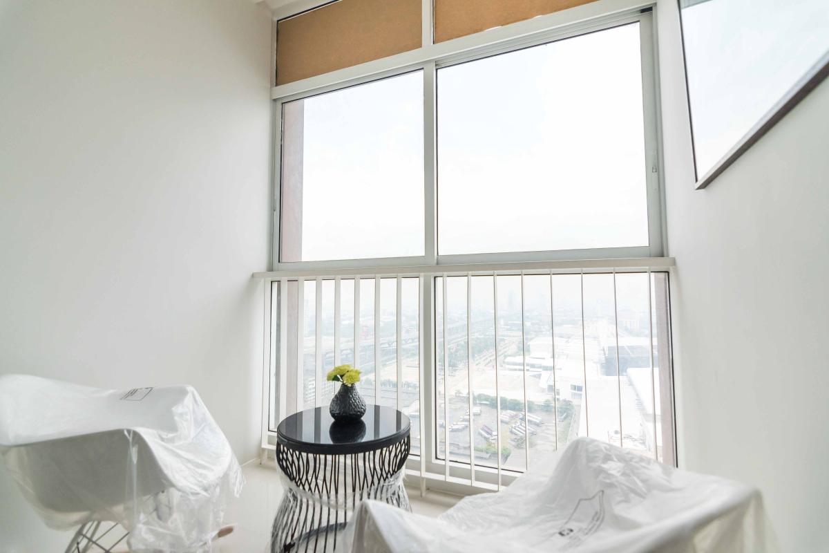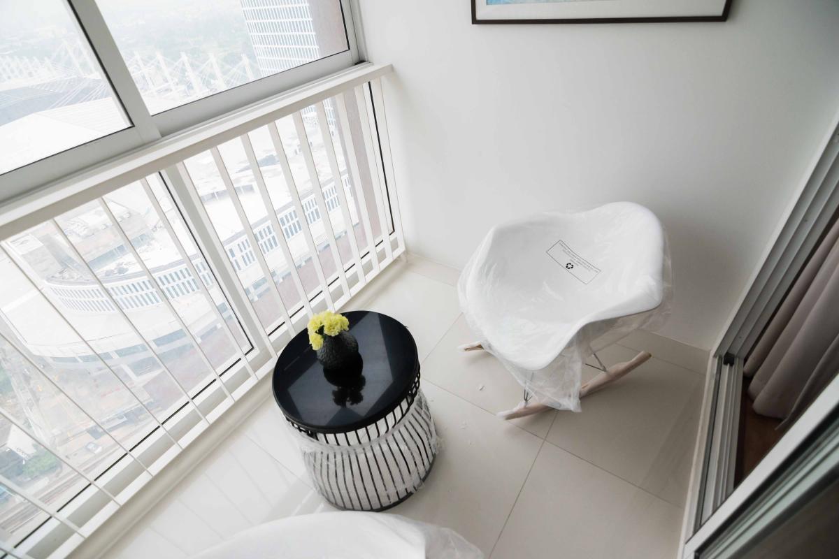 เนื่องจากเป็นคอนโดแบบ High rise บริเวณระเบียงจึงไม่ได้ทำเป็น OPEN AIR จริงๆ ยังมีกระจกใสอีกชั้นปิดไว้ เพื่อความปลอดภัยแก่ลูกบ้าน