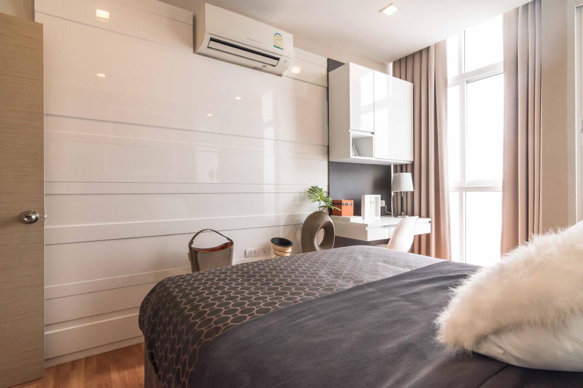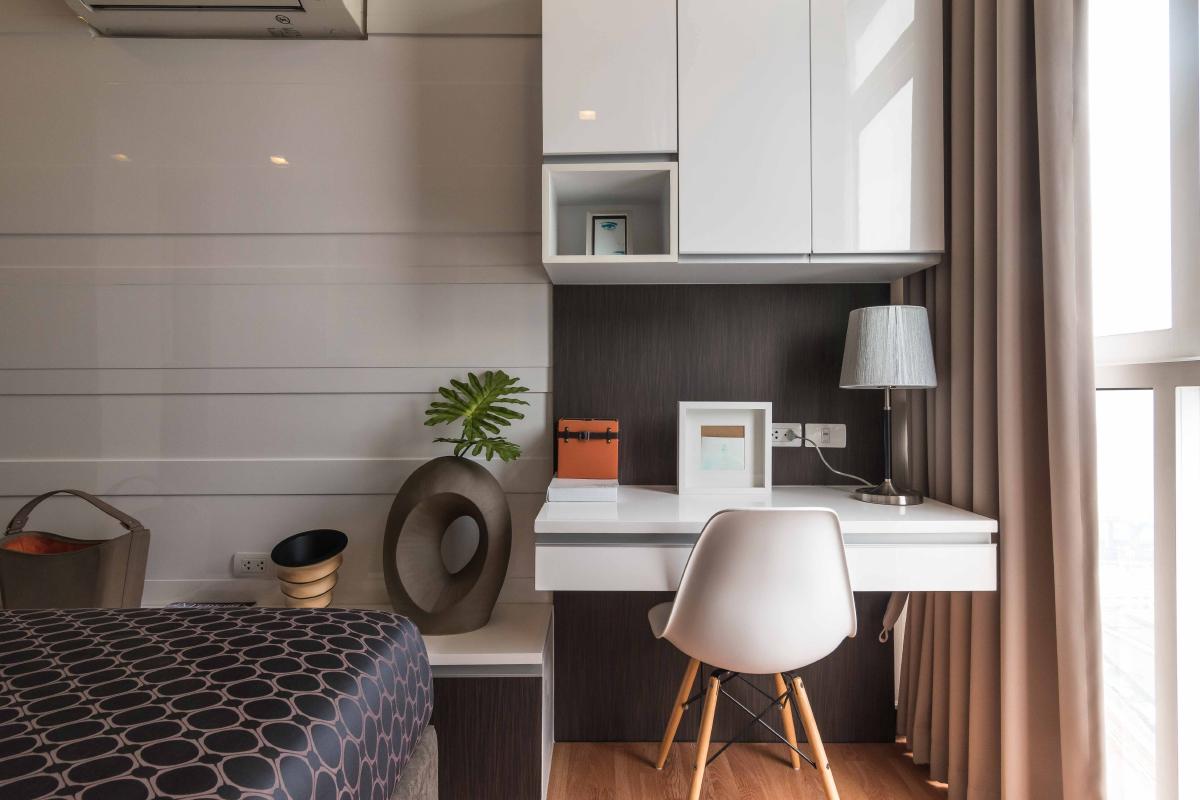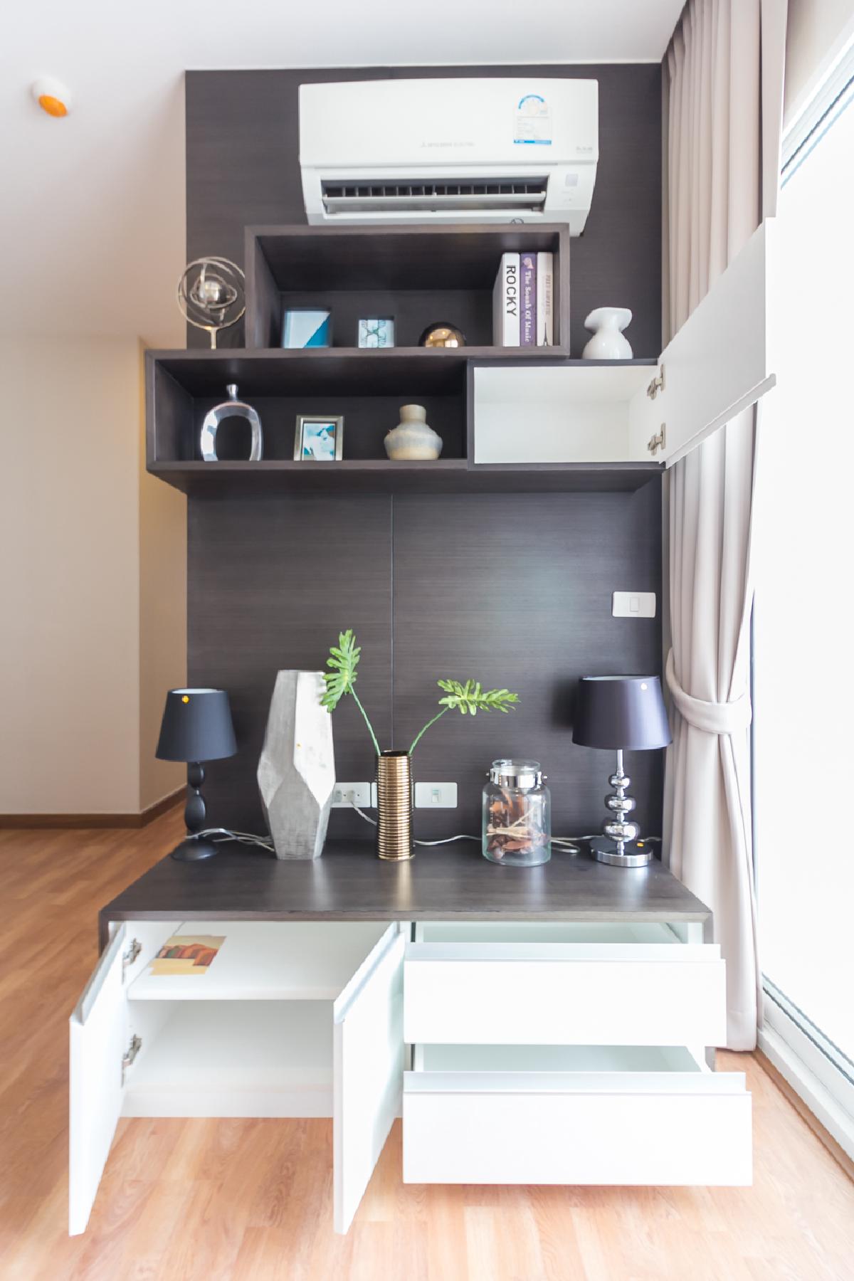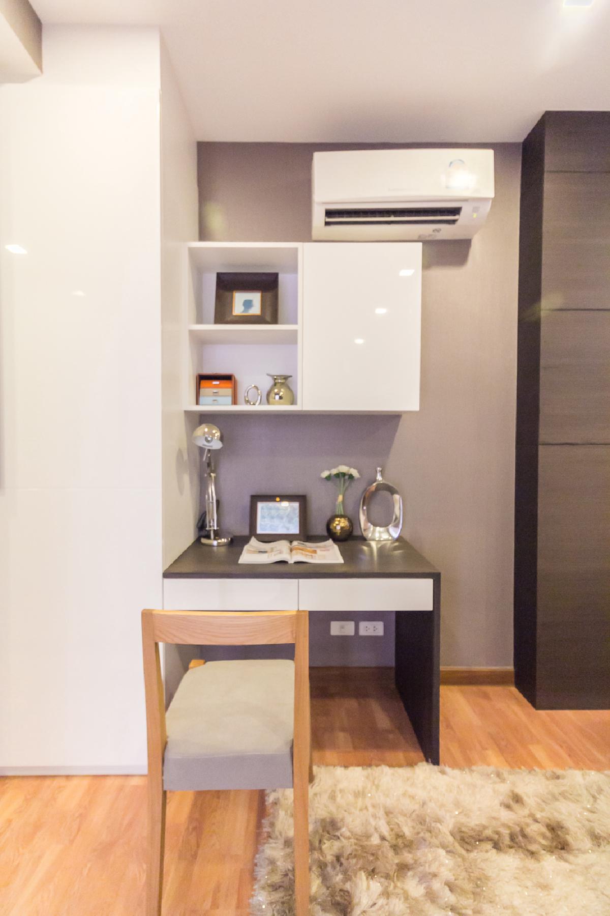 ผนังปลายเตียงจะเป็นที่ติดตั้งเครื่องปรับอากาศ ถัดไปทางขวามือจะเป็นโต๊ะทำงาน ที่มีชั้นเก็บของแบบ Built in อยู่ด้านบนเหนือหัว