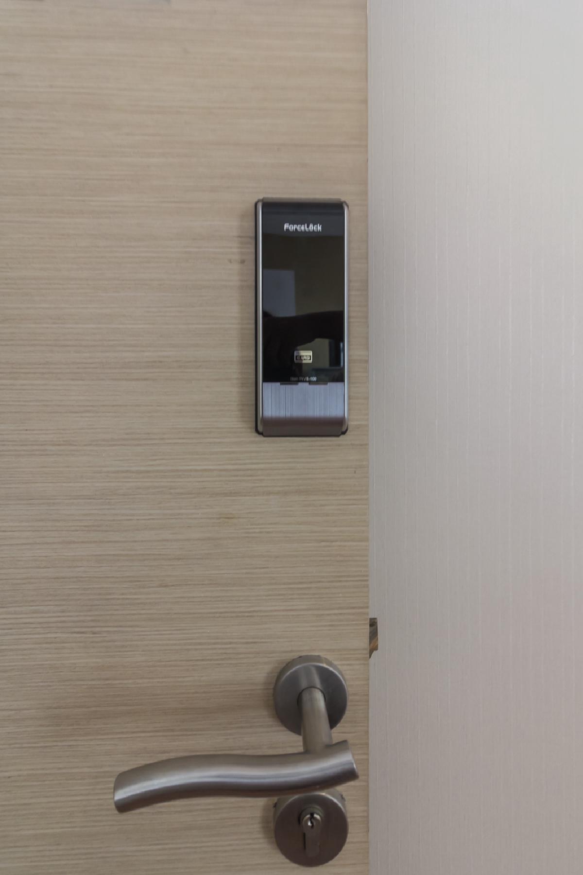 ประตูห้องจะไม้อัดกรุ ด้ามจับเป็นสแตนเลสแบบโยก มาพร้อมกับ Digital Door Lock