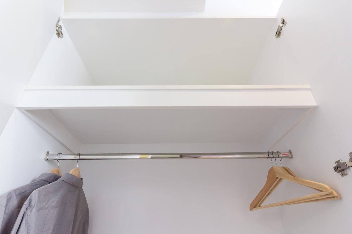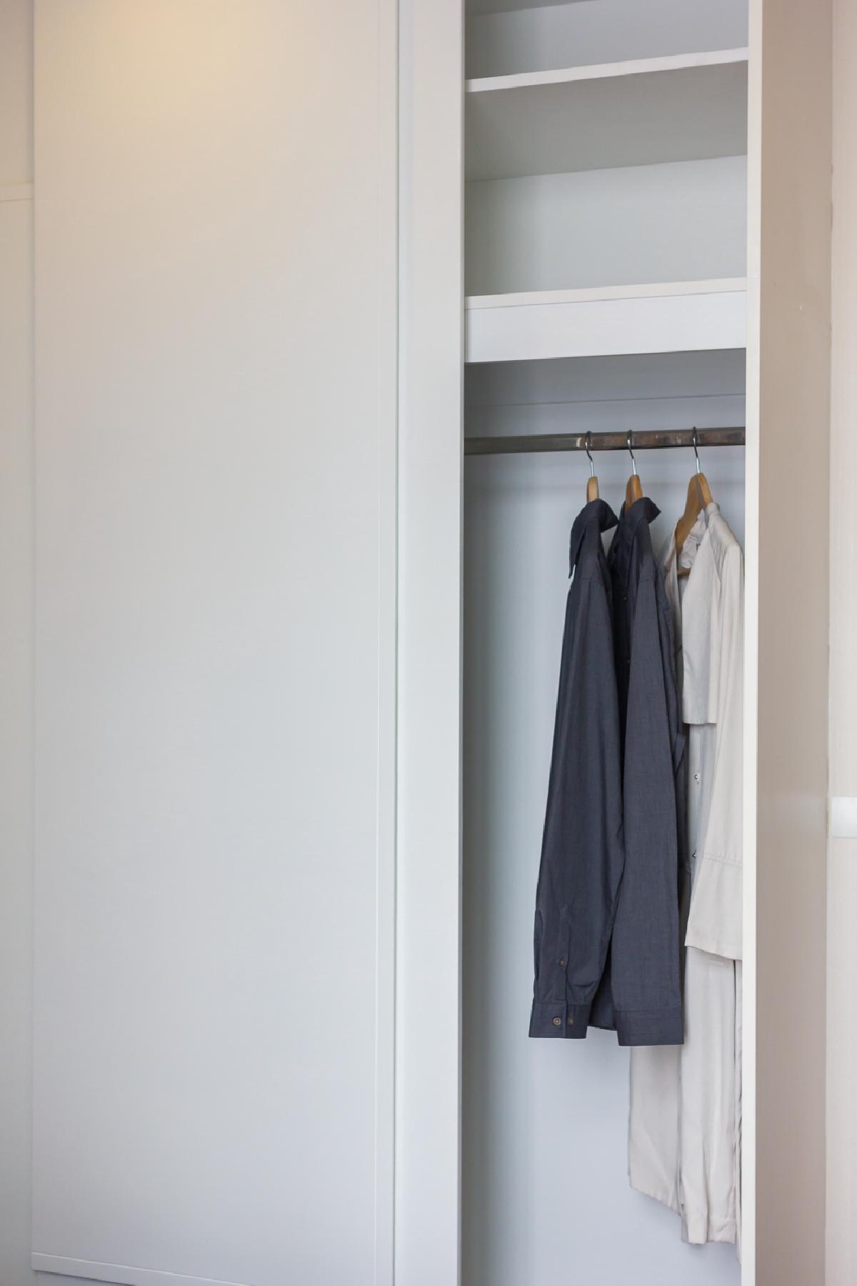 ตู้เสื้อผ้าเป็นแบบ Built in แบบ 2 บานโดยแบ่งเป็นแบบราวแขวนและลิ้นชัก
