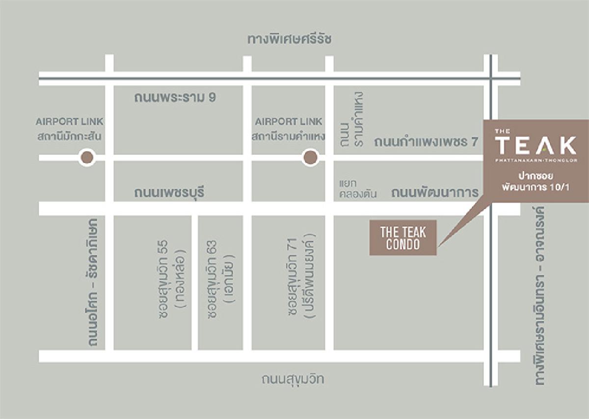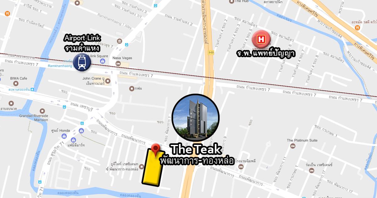 ทำเล : คอนโด The Teak พัฒนาการ-ทองหล่อ อยู่ติดถนนพัฒนาการ หากวิ่งมาทางเพชบุรีผ่านแยกคลองตัน คอนโดจะอยู่ทางขวา ต้องกลับรถใต้สะพาน ตรงจุดขึ้นทางด่วนรามอินทรา-อาจณรงค์ ซึ่งจะสะดวกต่อผู้ที่ใช้รถยนต์ส่วนตัว สามารถเข้าออกเมืองได้สะดวกรวดเร็ว ทั้งขาไปและขากลับ หรือจะใช้บริการแอร์พอร์ต ลิ้งค์ สถานีรามคำแหง ก็อยู่ห่างจากคอนโดไปประมาณ 500 เมตรเท่านั้น โดยรวมแล้ว The Teak พัฒนาการ-ทองหล่อ ตั้งอยู่ในทำเลที่ค่อนข้างสะดวกต่อการคมนาคมเกือบทุกรูปแบบ มีรถสองแถวและรถโดยสารประจำทางผ่านหน้าคอนโดด้วยเช่นกัน ทั้งยังไม่ห่างไกลความเจริญมากนัก แต่จะเงียบสงบกว่าย่านเอกมัย-ทองหล่อที่อยู่ใกล้เคียงกัน