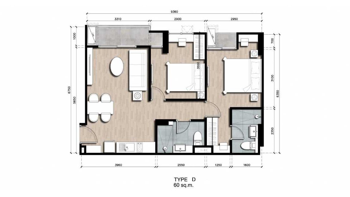 ห้องขนาด 60 ตารางเมตร ถูดจัดสรรปันส่วนให้มีความลงตัวกับผู้พักอาศัย 2-3 คนหรือจะอยู่กันเป็นครอบครัวก็ได้เช่นกัน รูปแบบแปลนวางไว้อย่างง่ายๆ แต่กับให้ความส่วนตัวแก่เจ้าของห้องค่อนข้างมาก โดยจัดให้ห้องนั่งเล่นและห้องครัว ที่มักใช้สำหรับการพักผ่อนและต้อนรับแขก อยู่นอกสุดติดกับประตู แล้วค่อยถัดเข้ามาเป็นห้องนอนเล็ก ,ห้องน้ำรับรอง และห้อง Master Bedroom มีระเบียงทอดยาวตามขนาดห้องนั่งเล่นและระเบียงย่อยอยู่ตรงห้อง Master Bedroom ช่วยในการเปิดรับแสงจากธรรมชาติ ทำให้ห้องสว่าง ปลอดโปล่ง และดูกว้างขึ้น สร้างบรรยากาศห้องให้รู้สึกเหมือนอยู่บ้าน