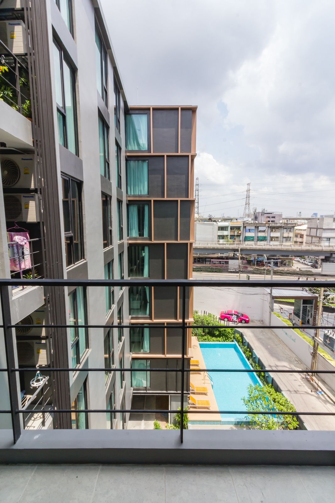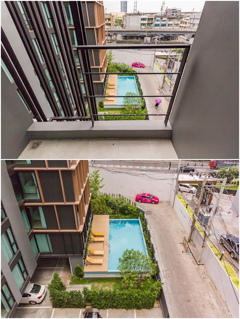 ราวกันตกสูงประมาณ 1 เมตร จากห้องนี้จะหันไปทางหน้าโครงการมองเห็นวิวเมือง วิวสระว่ายน้ำ แต่ซี่เหล็กค่อนข้างห่างพอสมควร หากใครมีลูกตัวเล็กๆ ต้องคอยระวัง