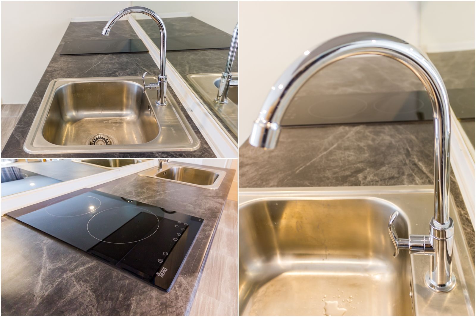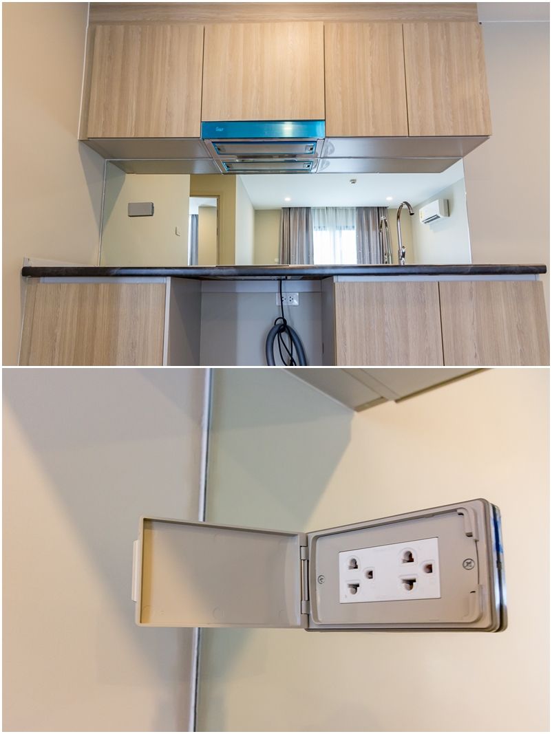 จะเห็นว่าด้านหลังเคาน์เตอร์ครัวได้ติดแผ่นกระจก จะช่วยหลอกตาให้ห้องดูกว้างขึ้นและยังเช็ดล้างคราบน้ำมันและสิ่งสกปรกออกไปได้ง่ายๆ ริมสุดมีปลั๊กไฟไว้ให้ใช้เสียบพวกเครื่องใช้ไฟฟ้าเพิ่มเติมอย่าง ไมโครเวฟ กาต้มน้ำ หรือเครื่องปิ้งขนมปัง