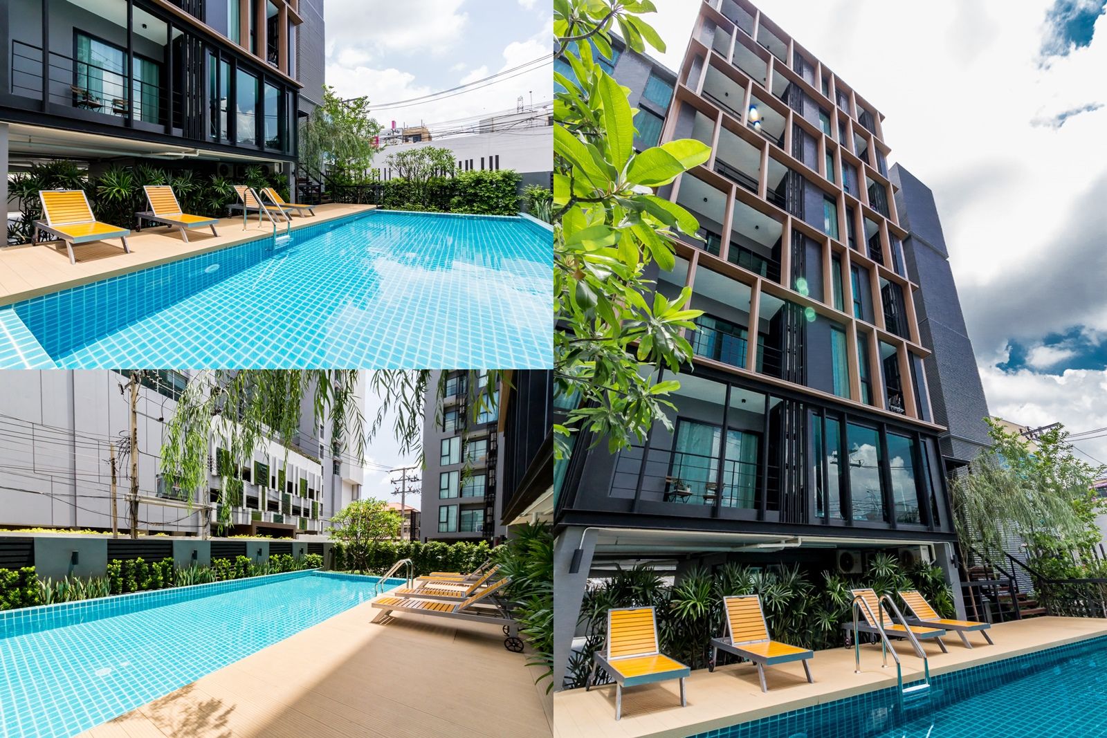 สระว่ายน้ำขนาด 5x12 เมตร พร้อมที่นั่งริมสระ เอาไว้พักผ่อนชิวๆ ไม่เน้นว่ายจริงจัง และมีเพียงห้องบางส่วนที่จะได้มองเห็นวิวสระว่ายน้ำ