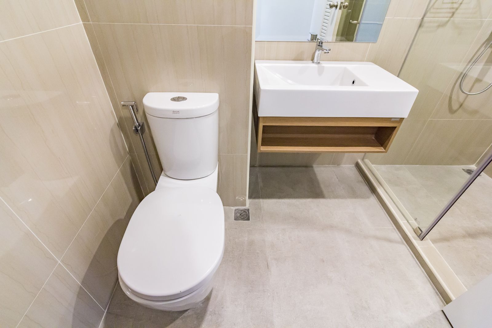 ห้องน้ำส่วนตัวหน้าตาเหมือนห้องน้ำข้างนอก มีทั้งโซนแห้งและเปียก สุขภัณฑ์ของ American Standrad