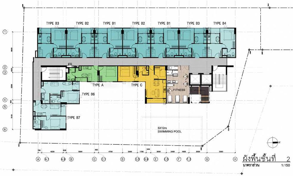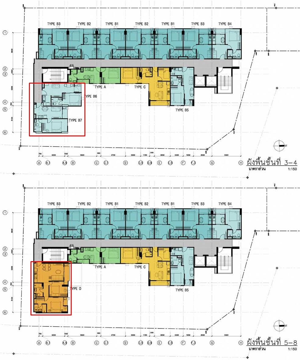 ส่วน ชั้น 5-8 จะมีห้องทั้งหมดเหลือ 11 ห้อง เนื่องจากมีห้อง Type D แบบ 2 ห้องนอน (ห้องในกรอบแดง) เข้ามาแทน แบ่งเป็น