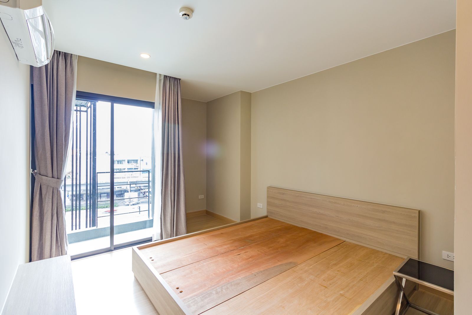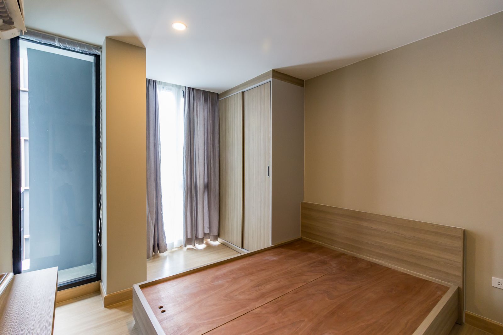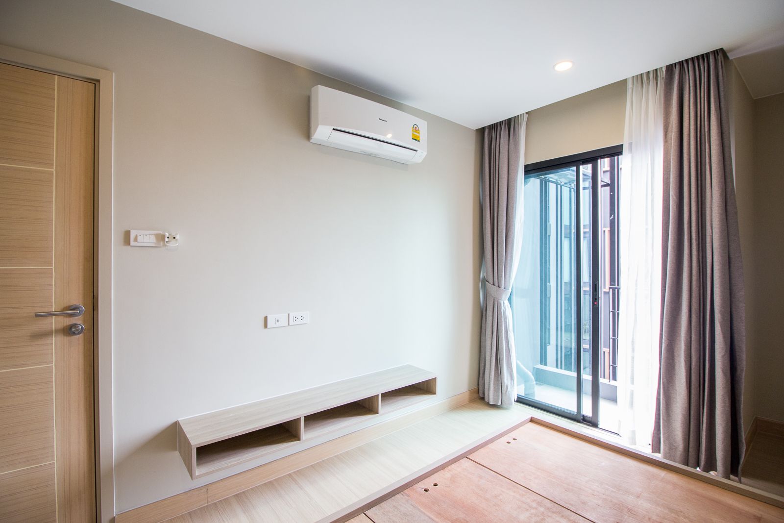 ส่วนปลายเตียงเหมือนกับห้องนอนเล็ก คือ Built in ชั้นวางโทรทัศน์พร้อมระบบเคเบิ้ล และมีเครื่องปรับอากาศขนาด 9,000 BTU ของ Panasonic ให้