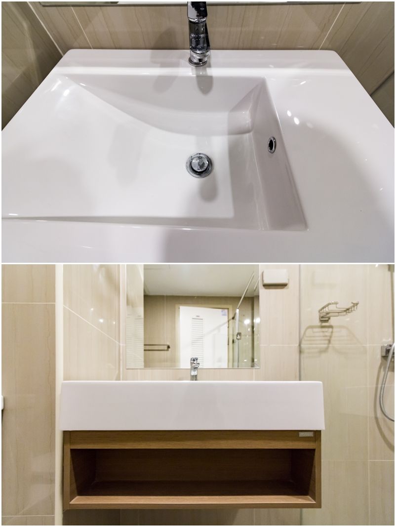อ่างล้างหน้ามีที่ให้วางพวกขวดสบู่และข้าวของชิ้นเล็กๆ ส่วนเคาน์เตอร์ใต้อ่างเป็นลามิเนต อาจเกิดการบวมน้ำได้