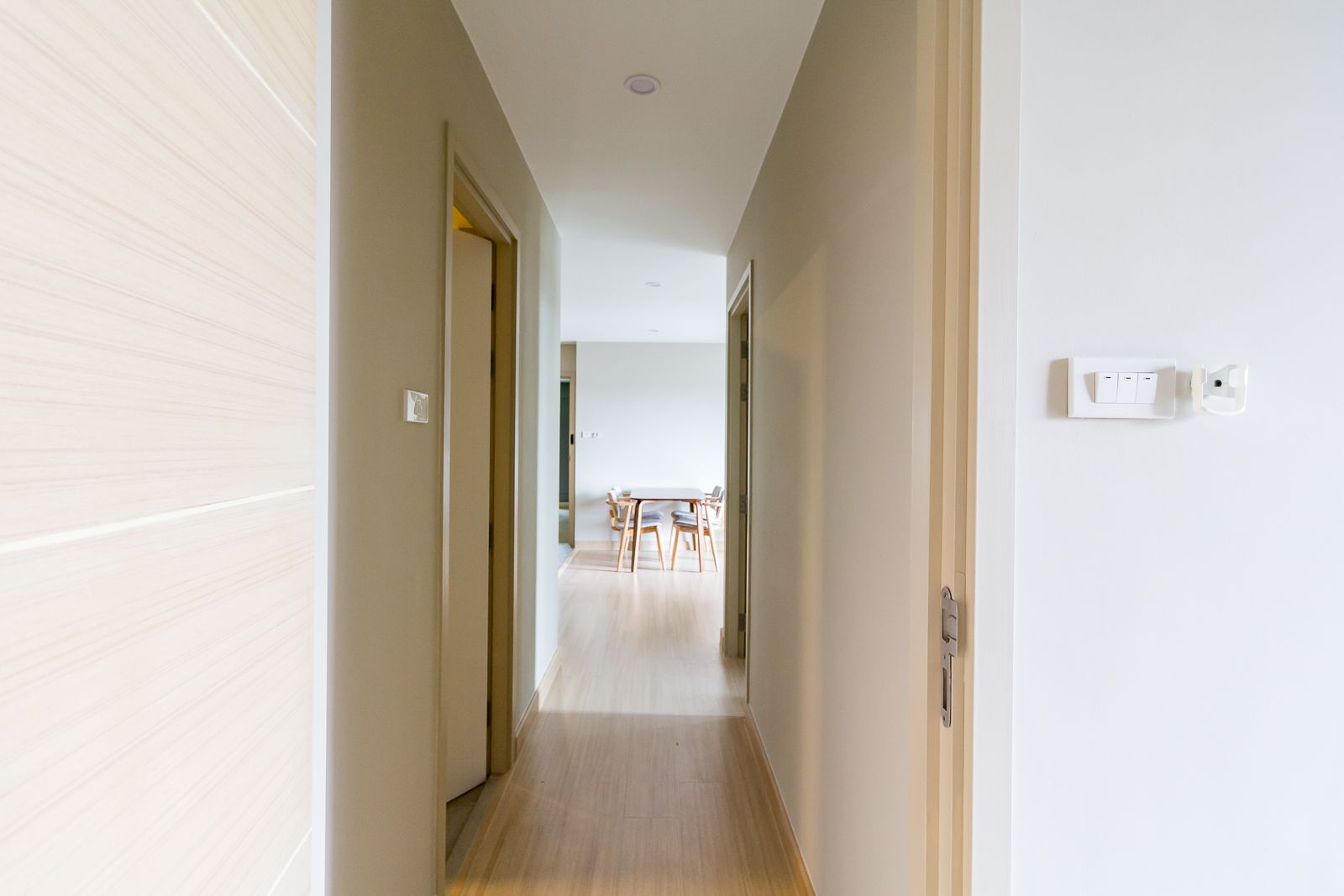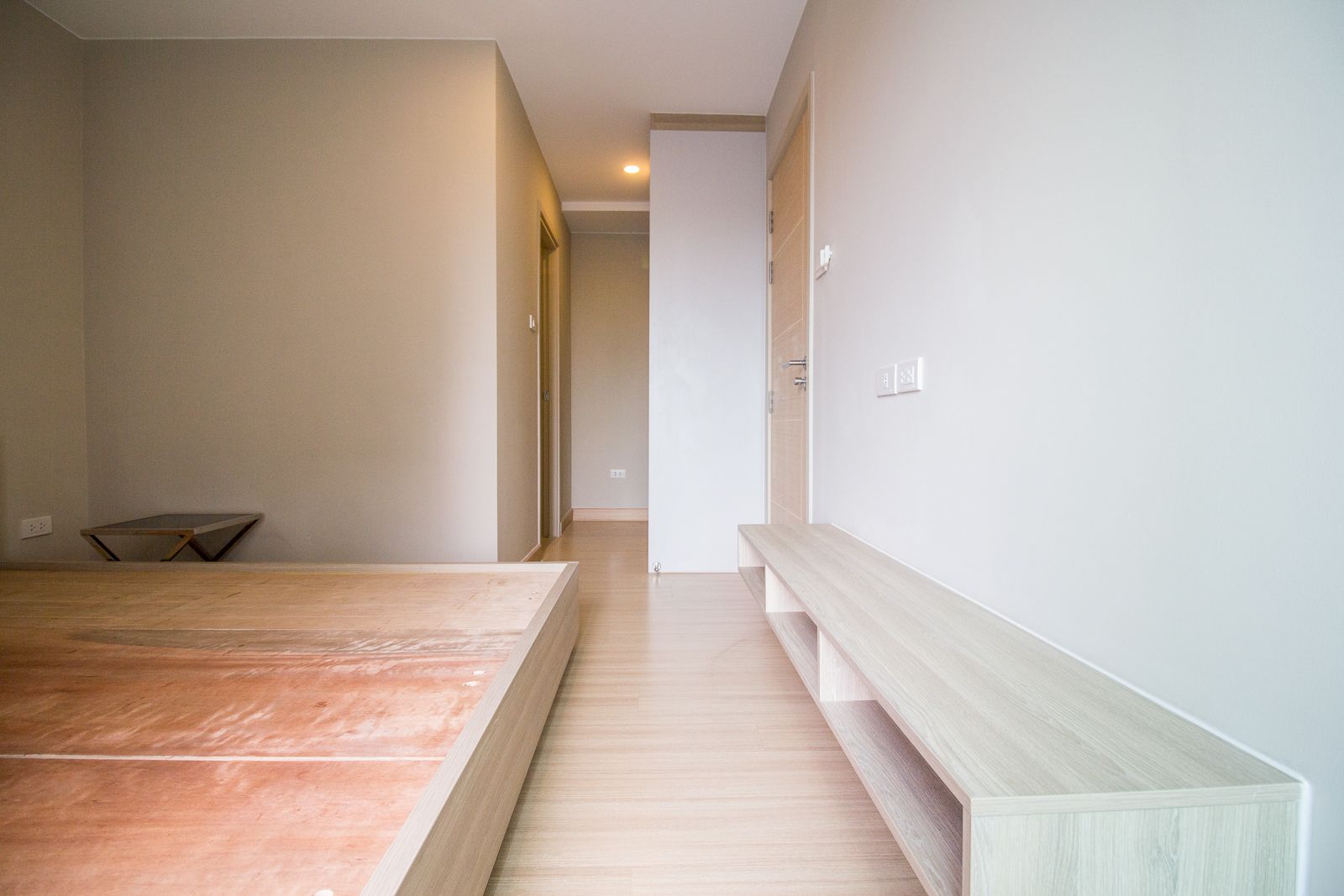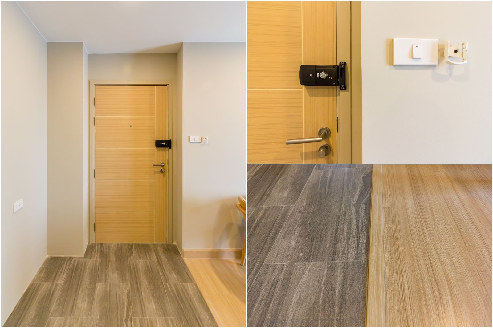 การเข้า-ออกห้องใช้ประตูบาน HDF ติดตั้งระบบ Digital Door lock ควบคู่กับกุญแจ เพิ่มความปลอดภัยแก่ผู้อาศัย ห้องสูง 2.5 เมตร พื้นปูลามิเนตสีไม้โอ๊คสลับกับกระเบื้อง Hemogeneous ในส่วนของห้องครัว ผนังทาสีฉาเรียบ กั้นพื้นที่ห้องด้วยยิปซั่มบอร์ด