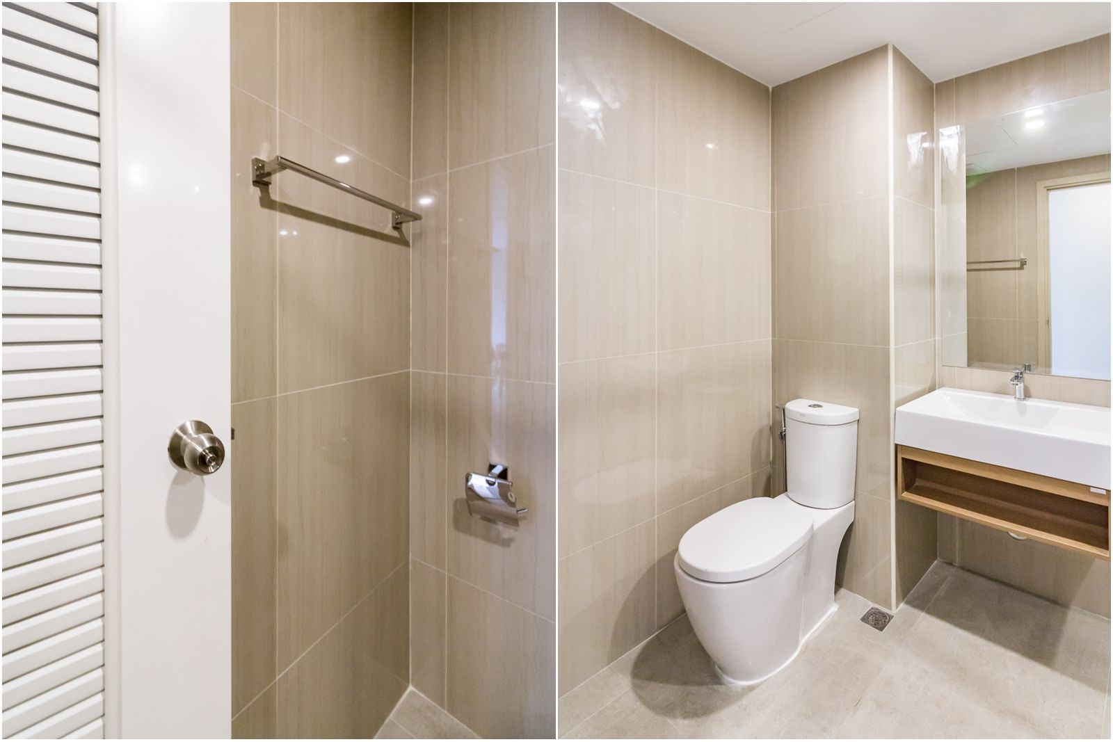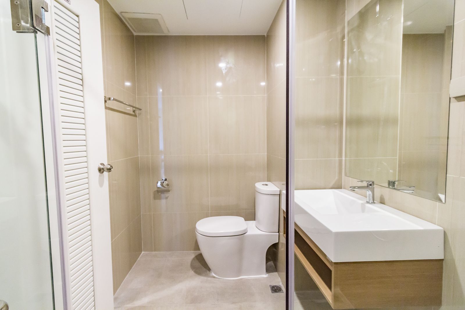 โซนแห้งติดตั้งชักโครกกับอ่างล้างหน้าไว้ใกล้กัน หากเปิดประตูห้องน้ำจะเห็นอ่างล้างหน้าก่อนเป็นอันดับแรก