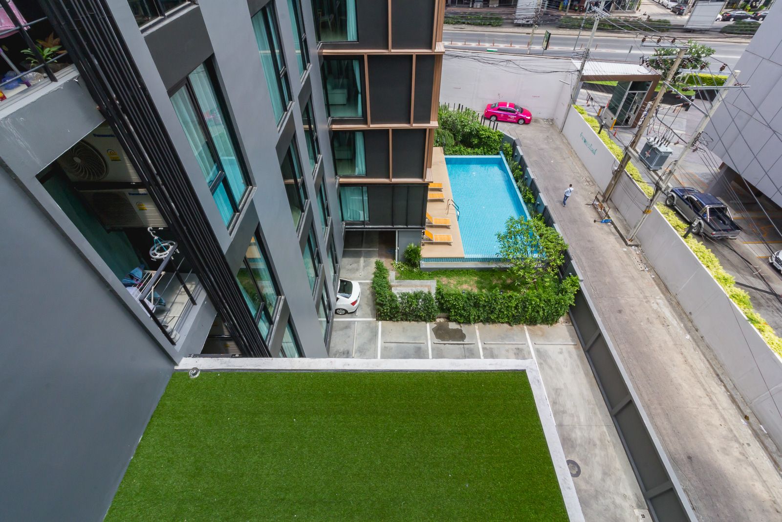 วิวจากบริเวณระเบียง จะมองเห็นสระว่ายน้ำและสวนเล็กๆ ช่วยให้ผ่อนคลายสายตาได้บ้าง