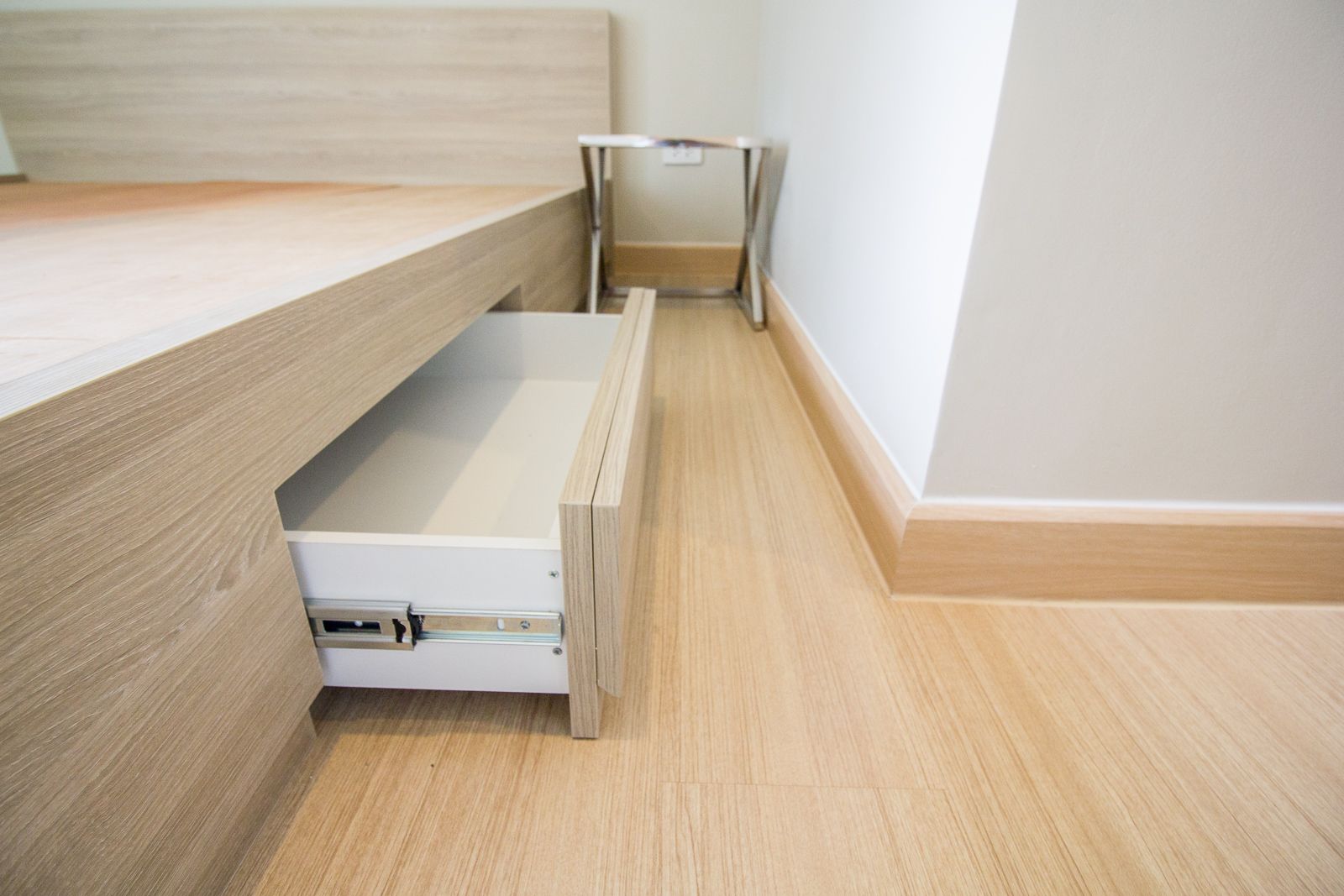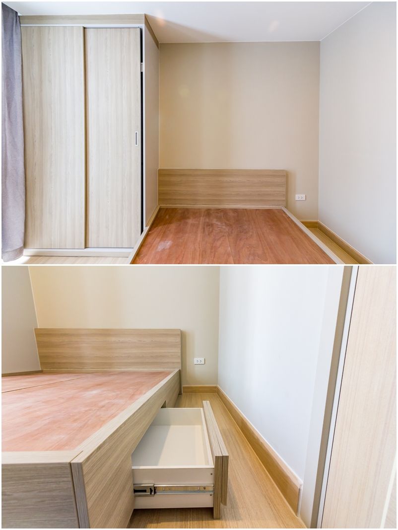 เตียงของ the teak พัฒนาการ-ทองหล่อ เป็นเตียงอเนกประสงค์ มีลิ้นชักให้เก็บของ