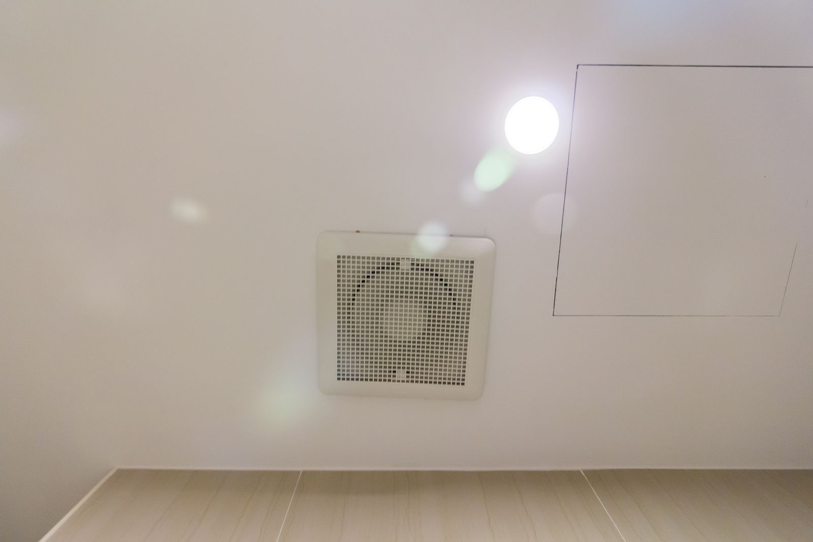 เครื่องดูดอากาศอยู่ด้านมุมพอดีกับตำแหน่งชักโครก ซึ่งเป็นตำแหน่งที่เหมาะสม