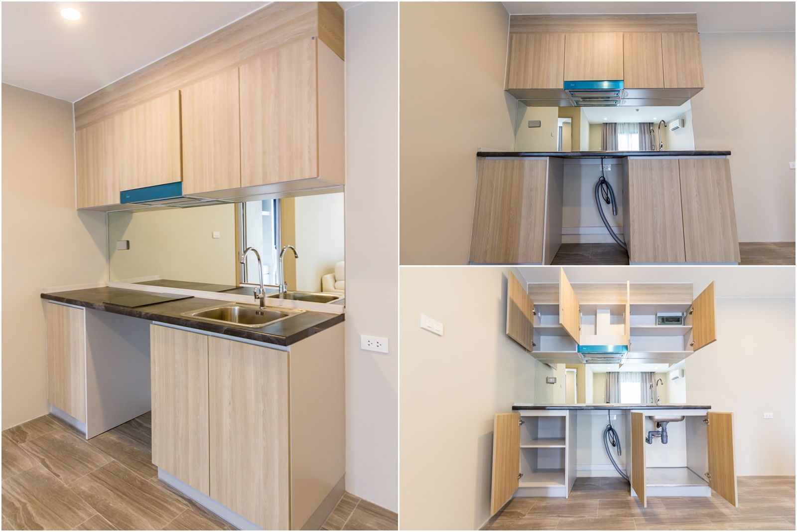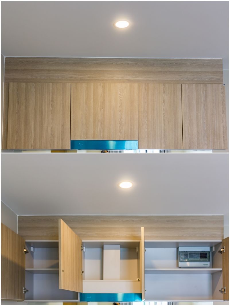 ชั้นเก็บของด้านบนอยู่ติดเพดาน อาจต้องเอื้อมเล็กน้อย บานเปิด-ปิด Softclose ยกเว้นแต่ตรงเครื่องดูดควันที่เป็นบานกดแบบ Popup