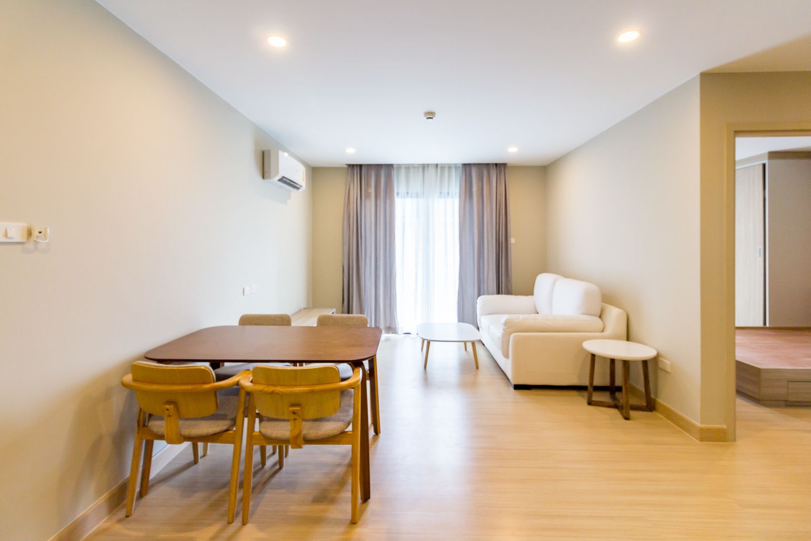 ห้องนั่งเล่นเชื่อมต่อระบียงพักผ่อน ช่วยให้ห้องสว่างและดูปลอดโปร่ง ไม่รู้สึกอึดอัดเมื่อต้องอยู่ในห้องนานๆ เครื่องปรับอากาศเป็นของ Panasonic ขนาด 12,000 BTU เพื่อให้ได้ความเย็นที่เหมาะสมกับขนาดห้อง