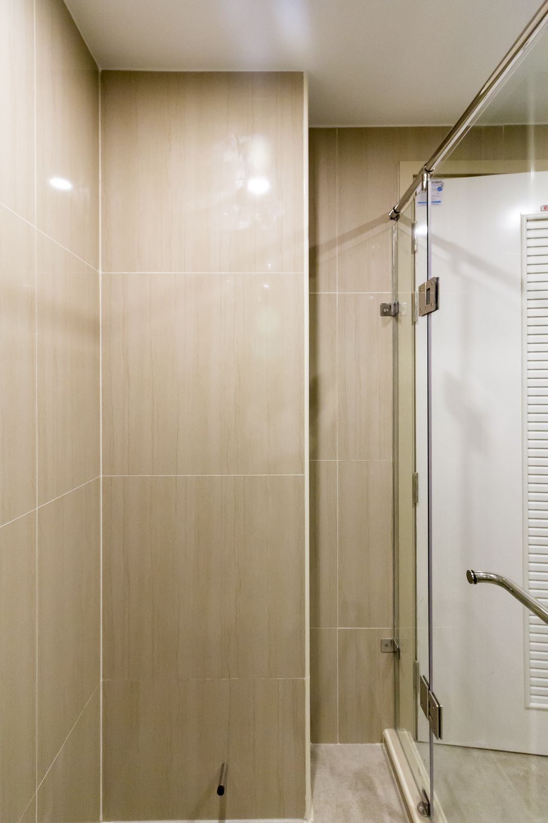 ห้องอาบน้ำกั้นด้วยแพลทติชั่นกระจก สูงเกือบ 2 เมตร อีกนิดก็จะถึงเพดาน ช่วยป้องกันน้ำกระเด็นได้ดี