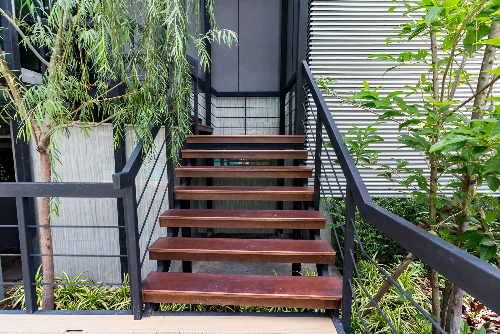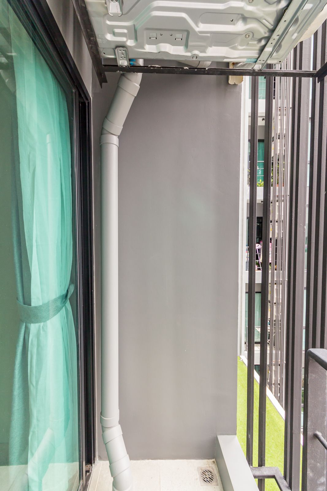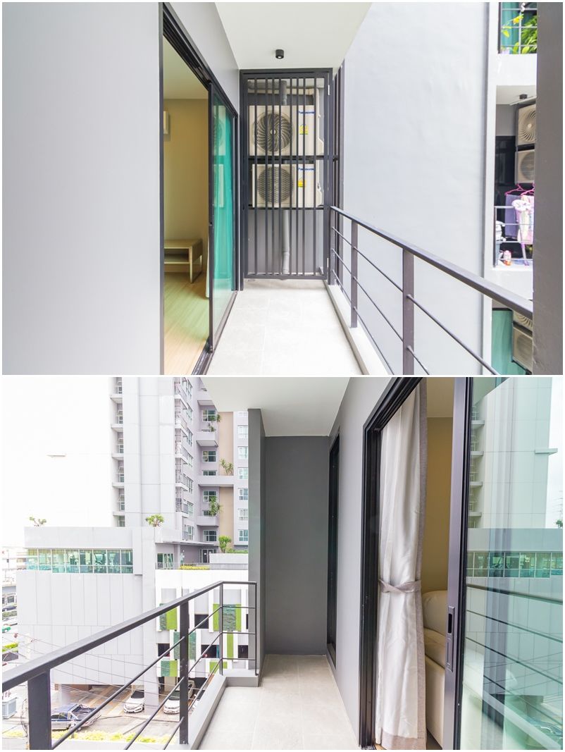 ระเบียงทรงยาวตามขนาดห้อง ทำให้ได้พื้นที่ใช้สอย ทำประโยชน์ได้เยอะขึ้น ฝั่งหนึ่งแขวนคอมเพรสเซอร์แอร์ไว้สองตัว ต่อให้หันหน้าเข้าด้านในก็ไม่ส่งผลอะไรต่อห้องมากนัก เนื่องจากพื้นที่ระเบียงค่อนข้างยาว อีกฝั่งจึงสามารถจัดทำเป็นสวนแนวตั้งเล็กๆ ปลูกต้นไม้ไว้ที่ระเบียง เพิ่มความน่าอยู่ให้ห้องเราได้