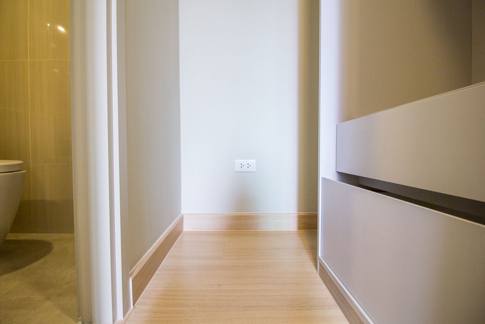ฝั่งตรงข้ามตู้เสื้อผ้าที่ผนังโล่งเปล่า ผู้พักอาศัยอาจติดกระจกและชั้นลอยเพิ่มเข้าไป ทำเป็นโต๊ะเครื่องแป้ง Built in เล็กๆ เพราะบริเวณนี้เป็นจุดที่แสงธรรมชาติส่องลงเต็มที่ ช่วยให้แต่งหน้าง่ายขึ้น อีกทั้งตู้เสื้อผ้ายังเป็นบานเลื่อนสลับจึงไม่มีปัญหาเกะกะขวางทางแน่นอน