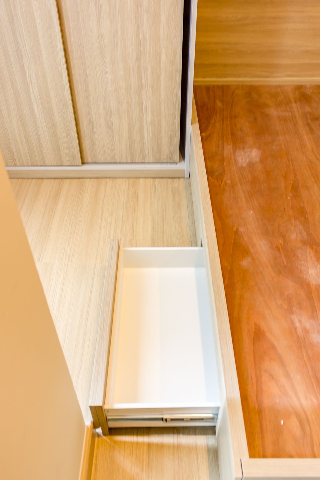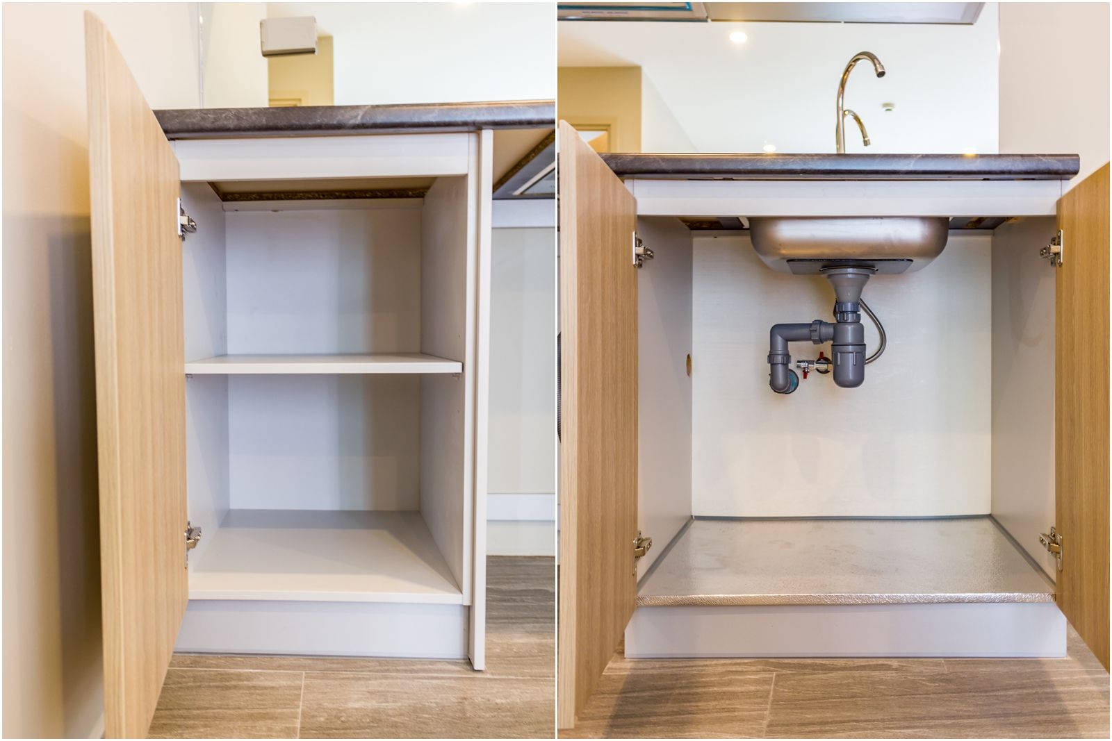 ตู้ด้านล่างเป็นลามิเนต บาน Softclose เหมือนกัน อาจจะไม่ได้แบ่งพื้นที่ไว้เป็นสัดส่วนมากนัก แต่ก็สามารถใช้เก็บของชื้นใหญ่ หรือซ่อนถังขยะใบเล็กไว้ข้างในได้