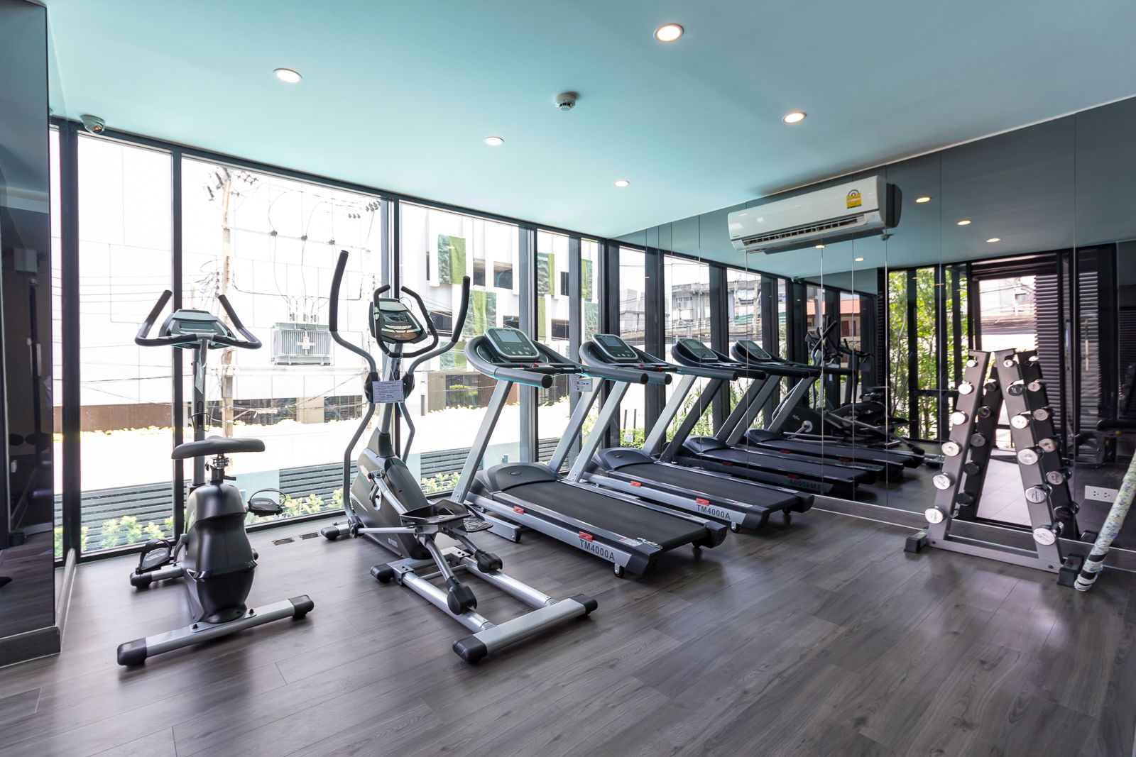 ภายในห้องฟิตเนสมีเครื่องเล่นประมาณ 5 ตัว กรุกระจกด้านหน้า ส่วนอีกฝั่งตกแต่งห้องด้วยกระจกเงา เพื่อเพิ่มมิติของห้อง มองแล้วจะรู้สึกว่าห้องกว้างขึ้น ลดความอึดอัด สามารถมองเห็นวิวสระว่ายน้ำ ช่วยผ่อนคลายขณะออกกำลังกาย