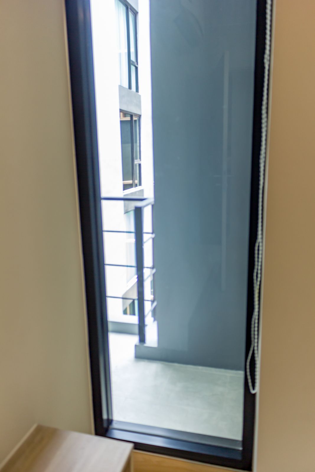 ระเบียงจะเล็กกว่าข้างนอกค่อนข้างมาก เอาไว้ยืนรับลมชิวๆ ราวกันตกสูง 1 เมตรเท่ากัน แต่จะมีช่องเล็กๆ อาจทำของรอดตกลงไปได้ง่าย หากใครที่มีลูกตัวน้อยอยู่ด้วย ยิ่งต้องควรระวังให้มาก อย่าปล่อยลูกน้อยไว้ที่ระเบียงตามลำพัง