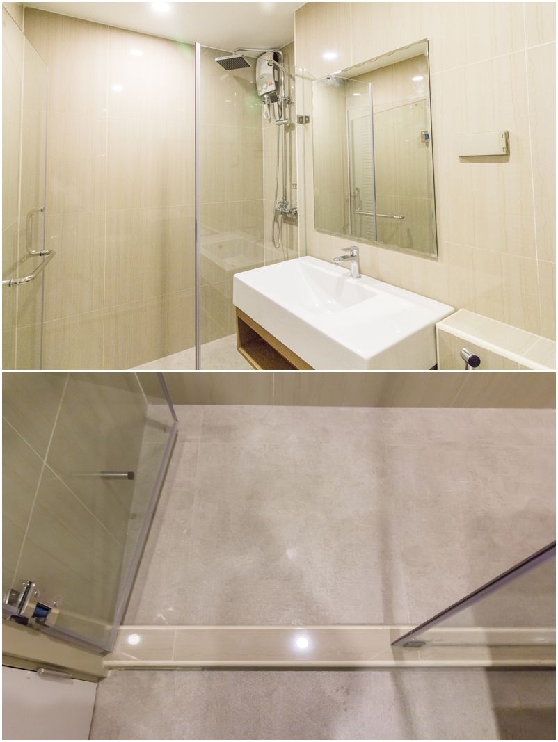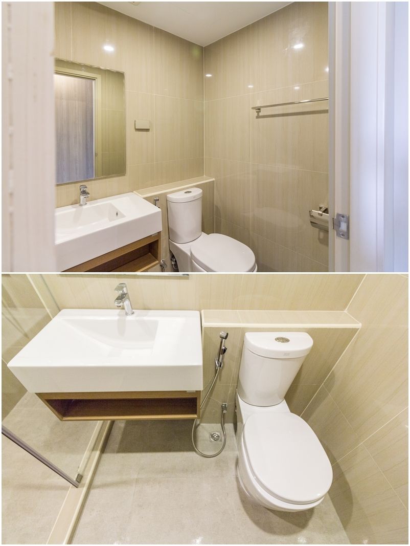 ออกมายังห้องน้ำฝั่งตรงข้าม ซึ่งถูกใช้เป็นห้องน้ำรวมของห้อง เพราะอยู่ติดกับห้องครัว มีการแบ่งพื้นที่โซนแห้งและเปียกเรียบร้อย สุขภัณฑ์ที่ทางคอนโด the teak พัฒนาการ-ทองหล่อ ติดตั้งเป็นของ American Standrad ทั้งเซต ได้แก่ อ่างล้างหน้า ชักโครก ฝักบัว และเครื่องทำน้ำอุ่น