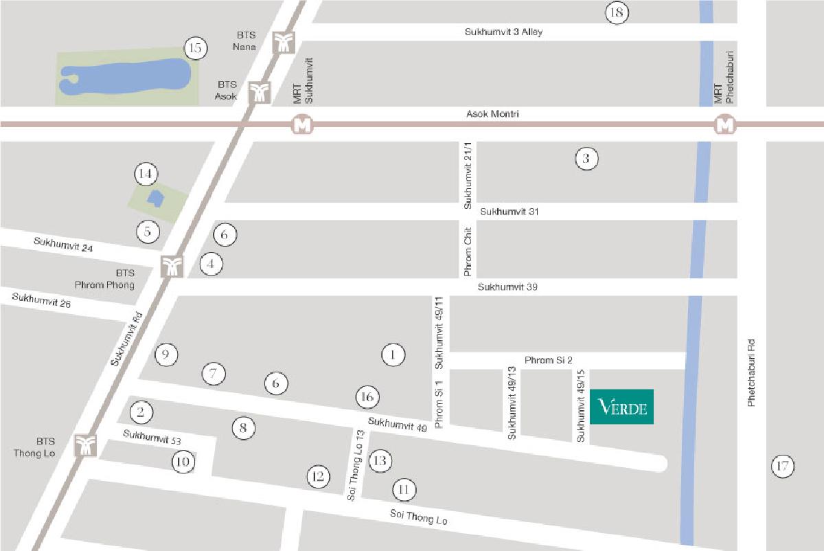 คอนโด Verde Sukhumvit 49 (แวร์เด สุขุมวิท 49) อยู่ใกล้รถไฟฟ้าหลายสถานี ได้แก่ ทองหล่อ พร้อมพงษ์ และอโศก